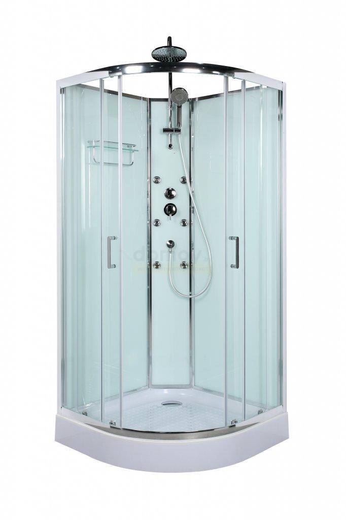Душевая кабина с задними стенками: прозрачное стекло FIX (4 мм), двери (5 мм); тонированное белое стекло (4 мм) задней стенки и центральное панели;