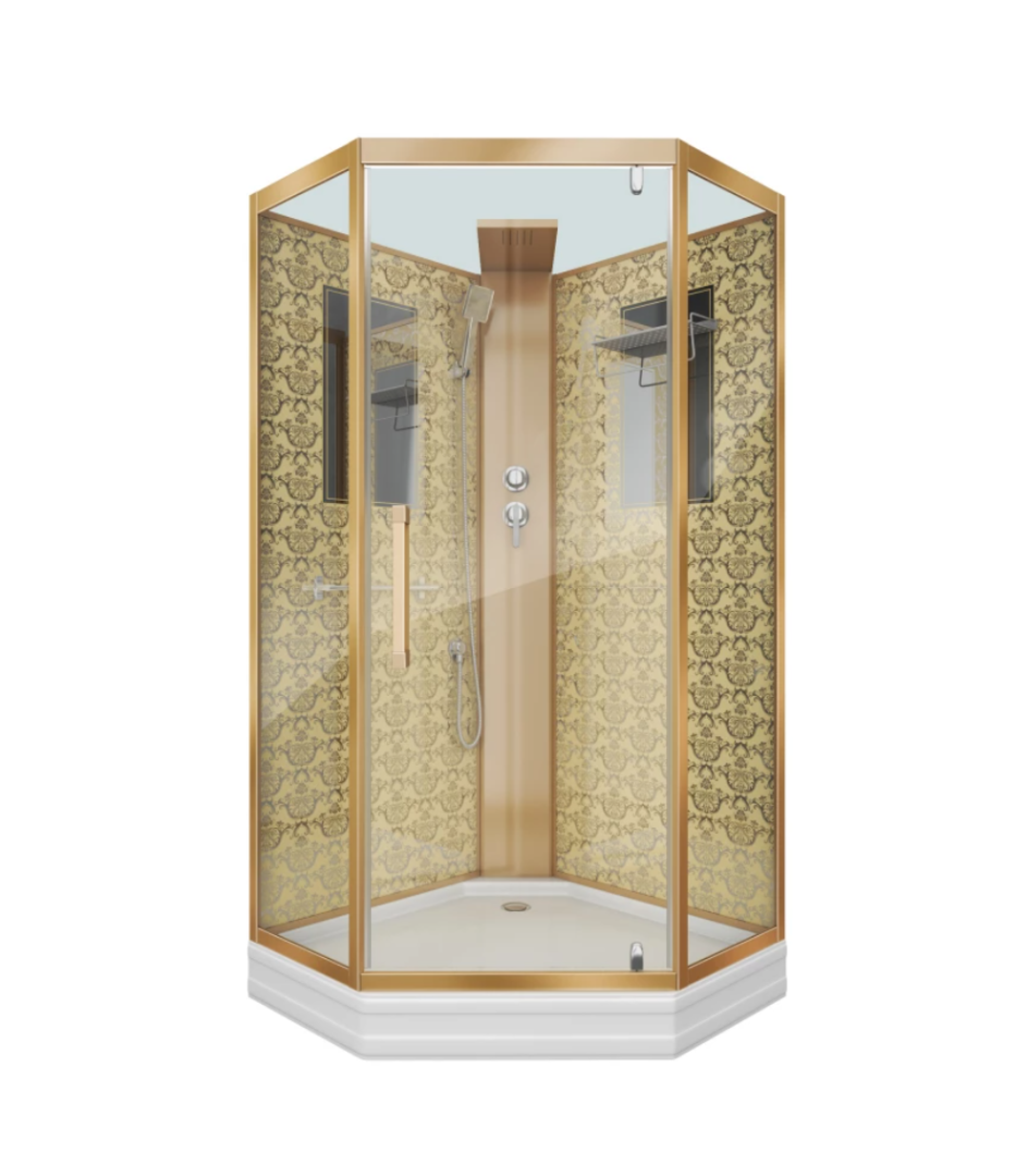 Пятиугольная душевая кабина Niagara NG-7717GBK – это отличный вариант для организации просторной душевой зоны. Модель имеет габаритные размеры 100 на 100 см. В установочном углу размещается центральная стойка из пластика. Она окрашена в золотистый цвет, как и задние стенки с вензельным рисунком, профиль и дверная ручка-скоба. Заканчивается стойка лейкой верхнего душа. Его крупные капли и мощный поток как бы обволакивают пользователя, имитируя ливень в тропиках.