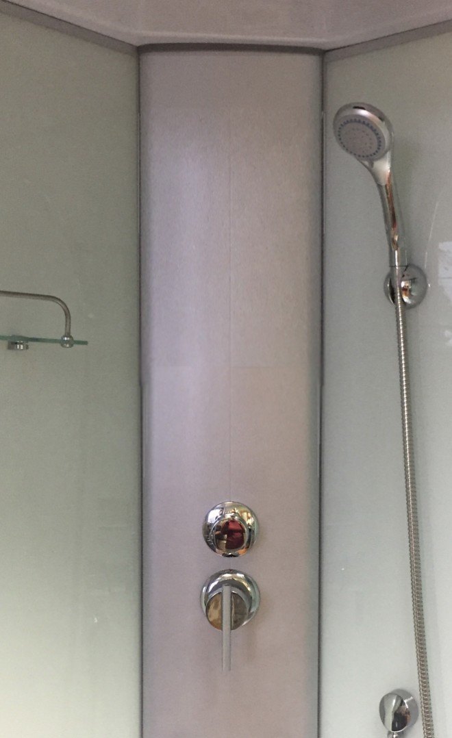 В комплект входит: тропический душ, съёмная душевая лейка, полочка, сиденье, сифон.