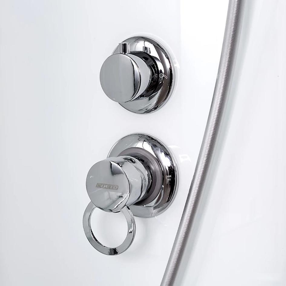 Надёжная и качественная душевая кабина Deto D10 позволит вам с комфортом принимать душ. Для этого кабина оборудована ручным душем с большой 14-сантиметровой лейкой. Она имеет легко очищающиеся силиконовые форсунки. Шланг душа оптимальной 150-сантиметровой длины может поворачиваться как вам удобно и не закручиваться. А если вы захотите освободить руки, то можно закрепить лейку на специальной штанге. Она расположена на задней стенке кабины. Также на задней стенке закреплены стеклянная полочка для шампуней, зеркало и крючок для мочалки.