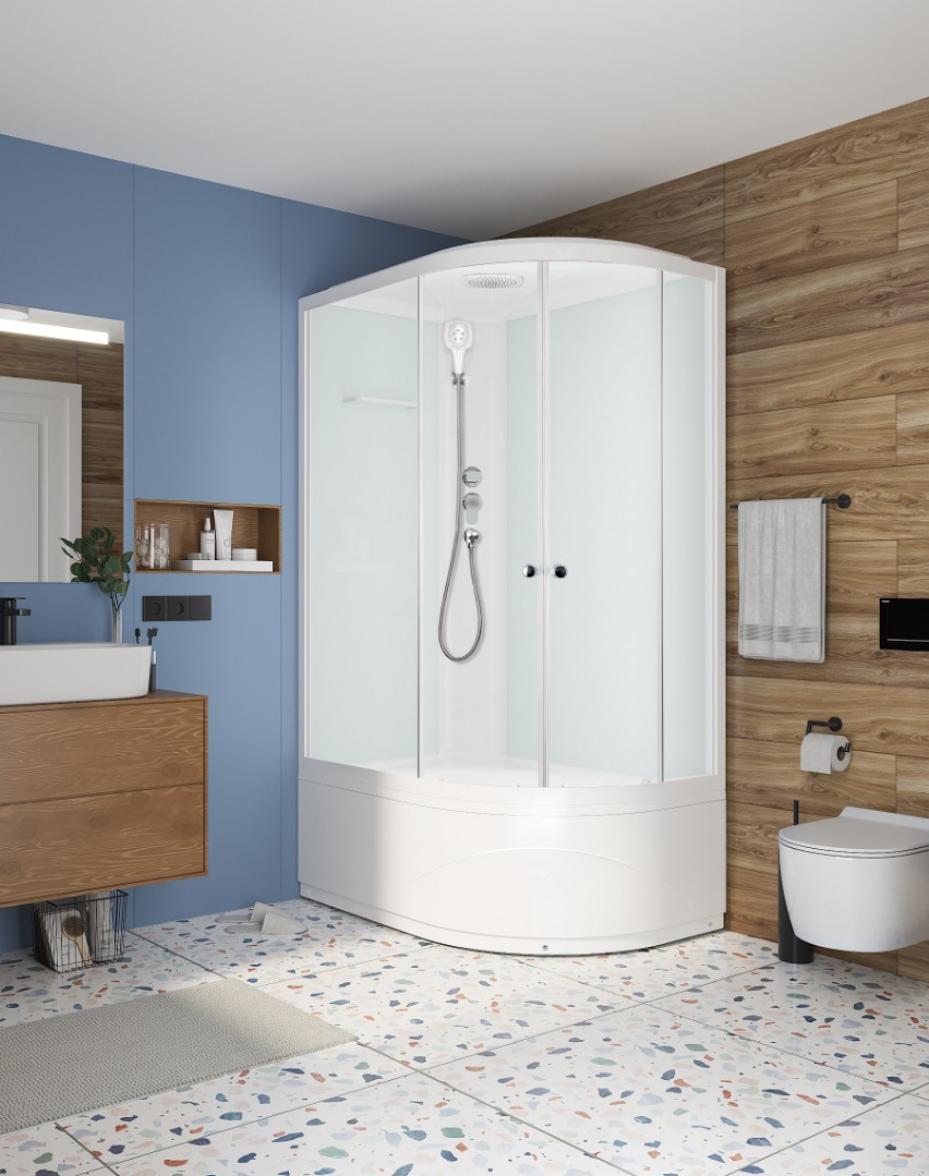 Душевая кабина Domani-Spa Delight Slim 128 high - практичная модель на высоком поддоне с белыми задними стенками и сатин-матированными передними стёклами. Душевая кабина изготовлена из санитарного акрила - гигиеничного материала, устойчивого к ударам. Размер, конструкция и оптимальная комплектация кабины гарантируют комфортное принятие водных процедур.