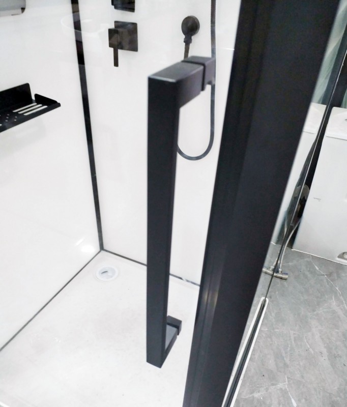 Душевая кабина прямоугольной формы, с конструкцией для быстрой сборки.