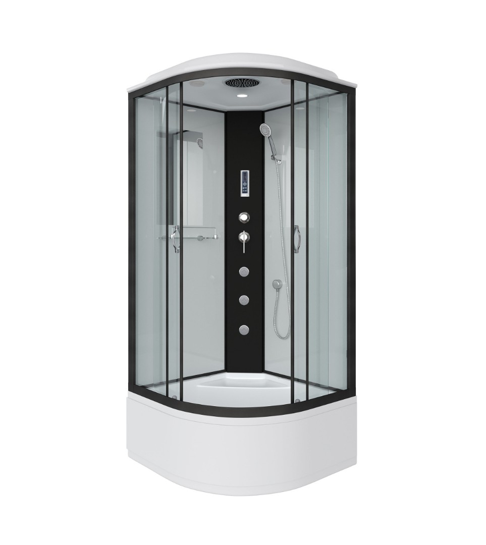 - Профиль выполнен в чёрном варианте, стенки и двери кабины - белые матовые. Центральная панель пластиковая чёрного цвета, на ней установлен смеситель с переключателем режимов.