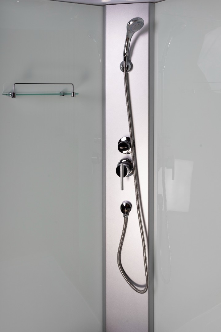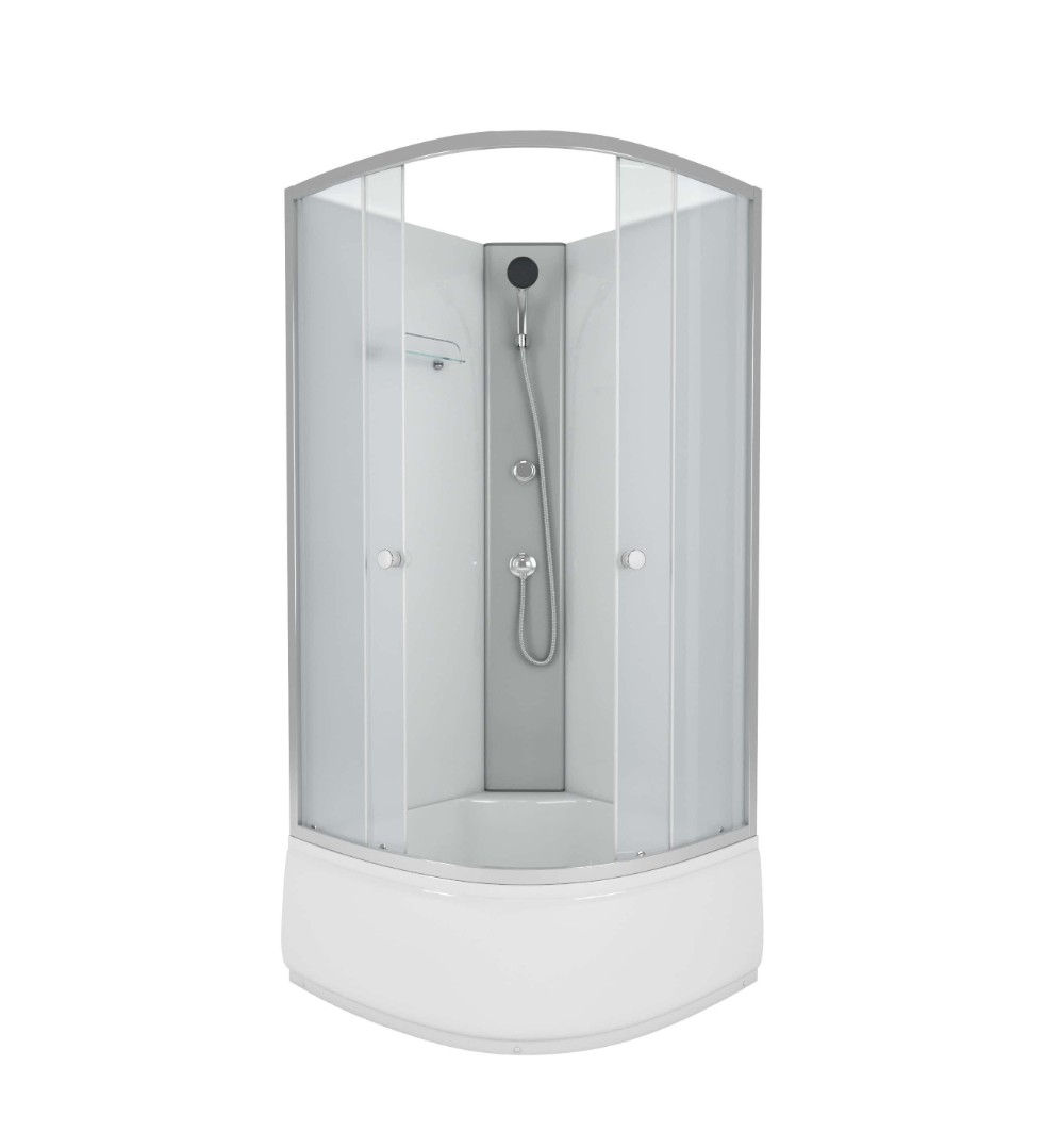 Комплектация: Поддон, сифон, панель, 4 профиля, 2 передние неподвижные стенки, 2 двери, 2 задние стенки, ручки, 4 ролика одноколёсные, центральная панель, смеситель, полочка.