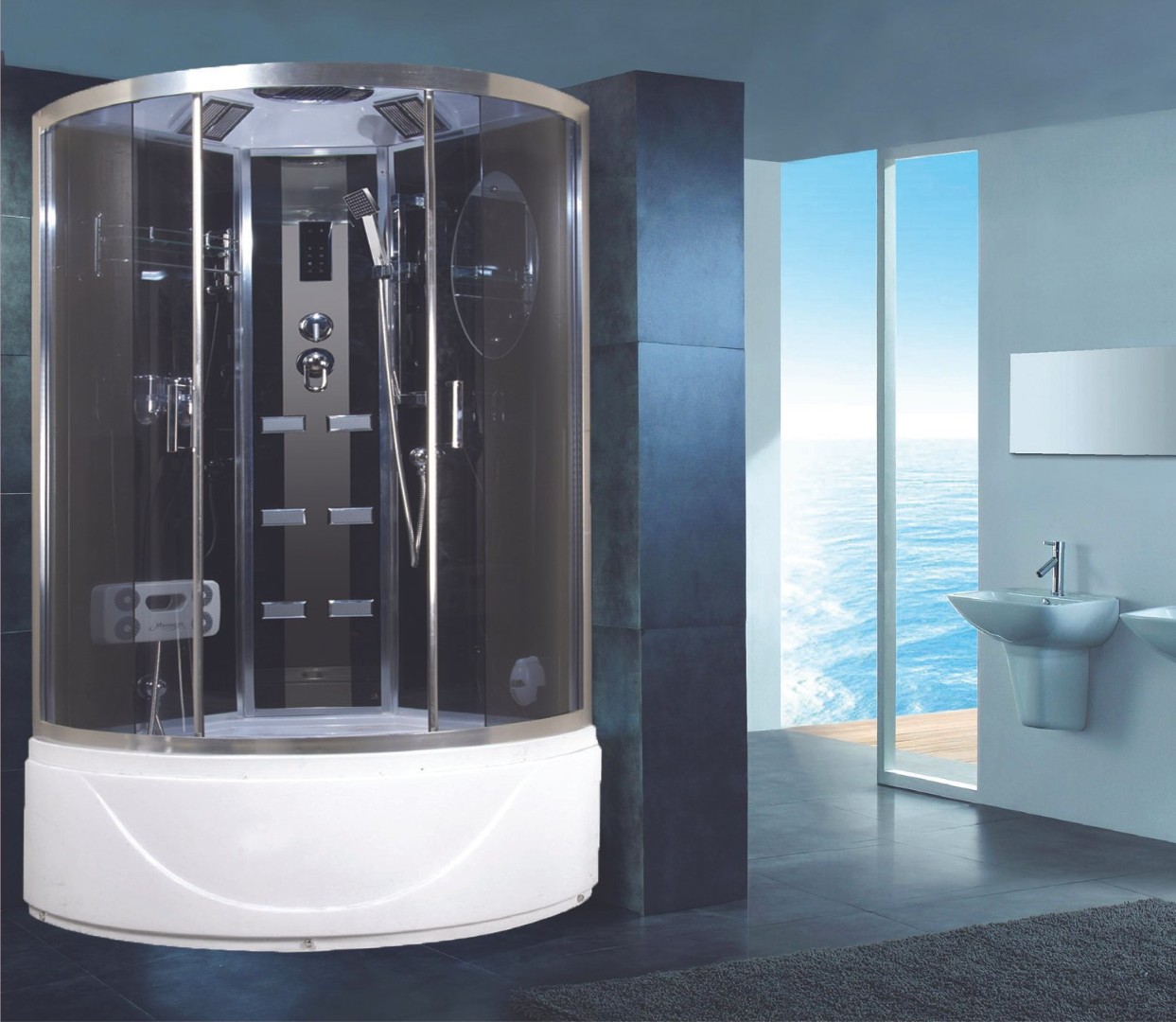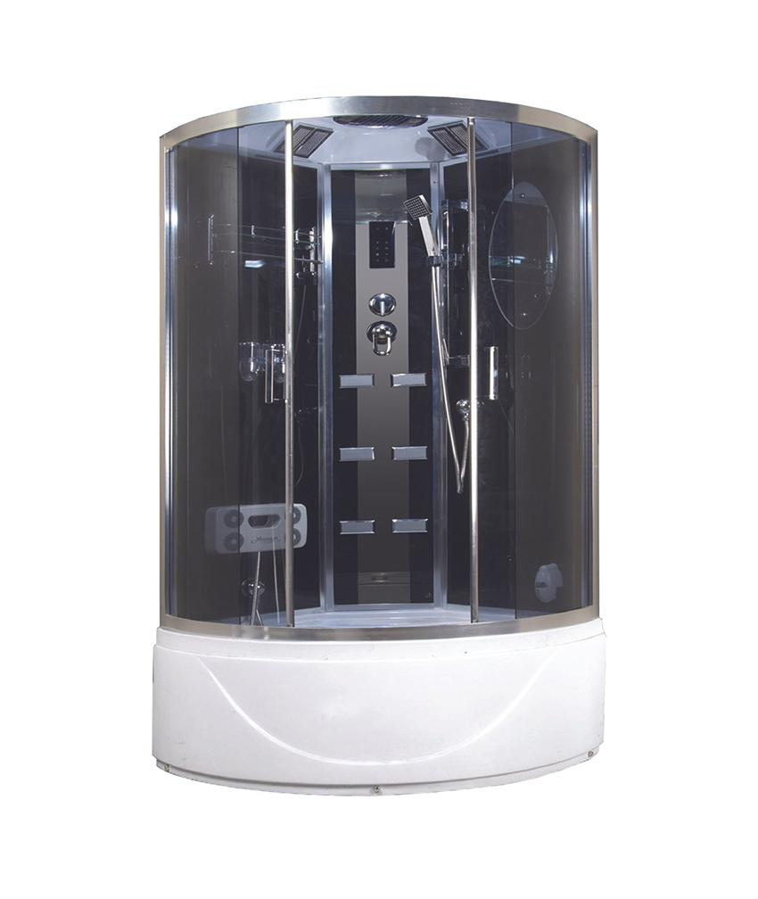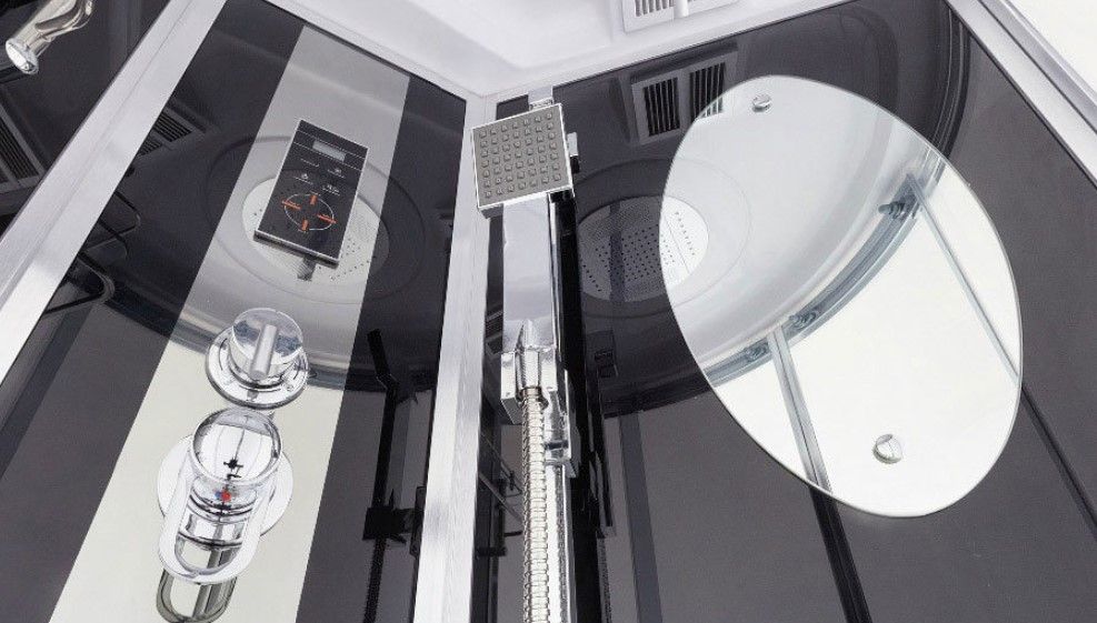 Кабина оборудована крышей с вмонтированной лейкой верхнего тропического душа. Есть принудительная вентиляция, верхнее освещение и радио. Управлять этими опциями Вы сможете при помощи пульта, расположенного на центральной стойке.