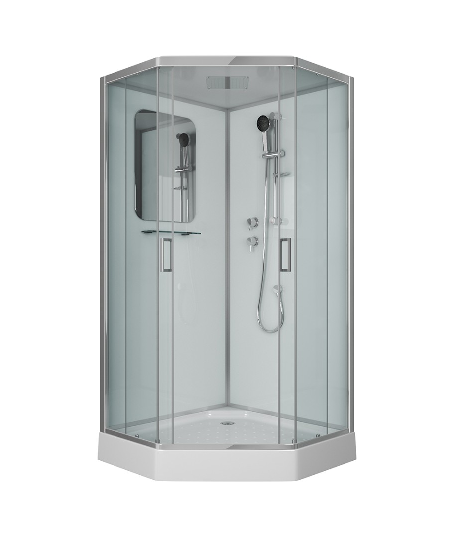 - Комплектация: сифон, тропический душ, шланг душа, штанга с мыльницей, полочка, зеркало, ролики, смеситель.