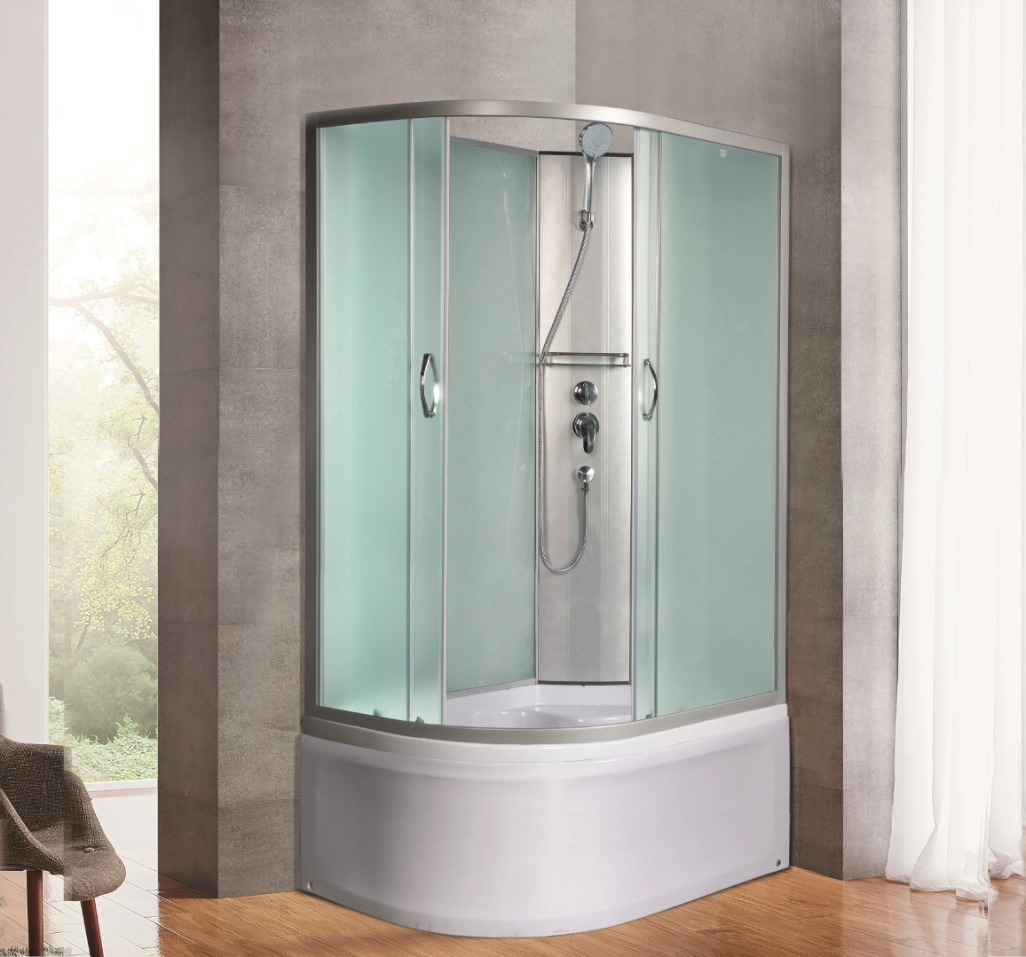 Асимметричная душевая кабина для пристенного монтажа. Закалённое травмобезопасное стекло 4 мм. Акриловый поддон, армированный стекловолокном, на регулируемых ножках.