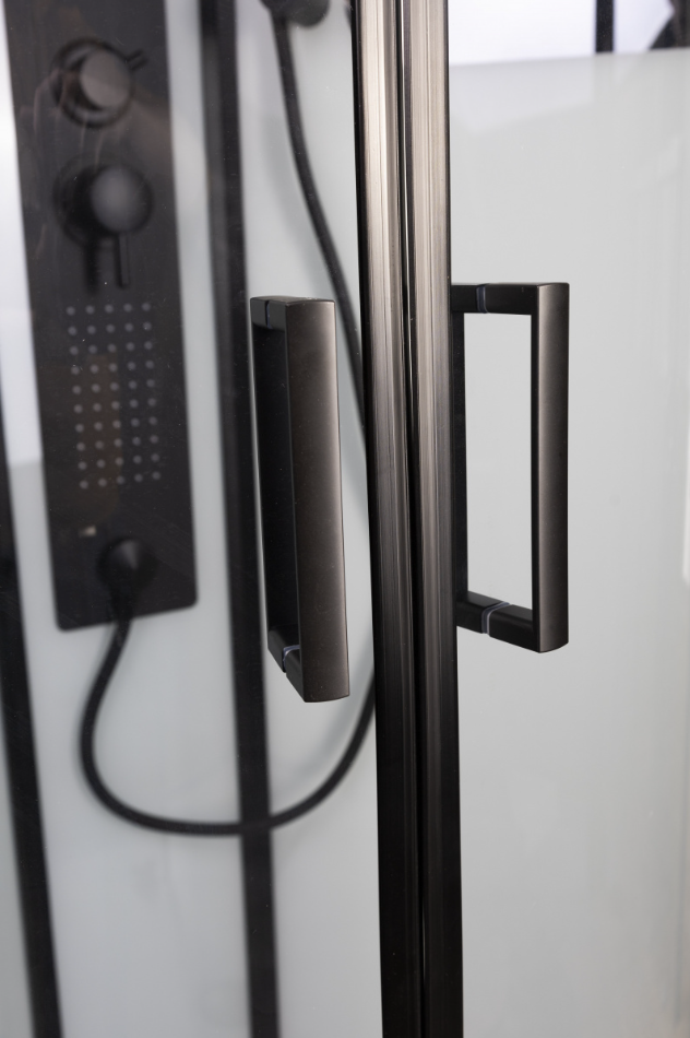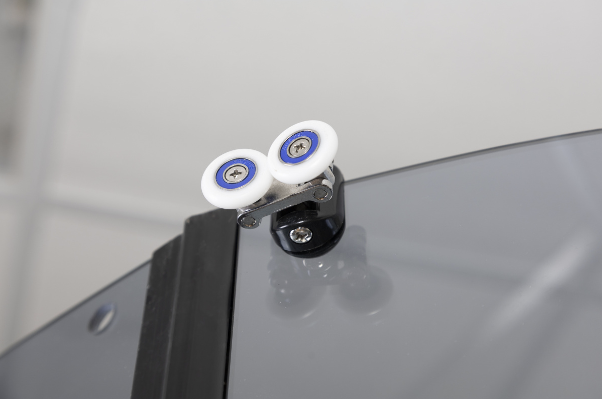 - Двери и переднее стекло: тонированные 6 мм, двери зарываются плотно с помощью магнитной ленты, вода не выплёскивается, так как установлены брызговики между дверью и неподвижной стенкой. Ручки дверей железные. Ролики стальные и надёжные.