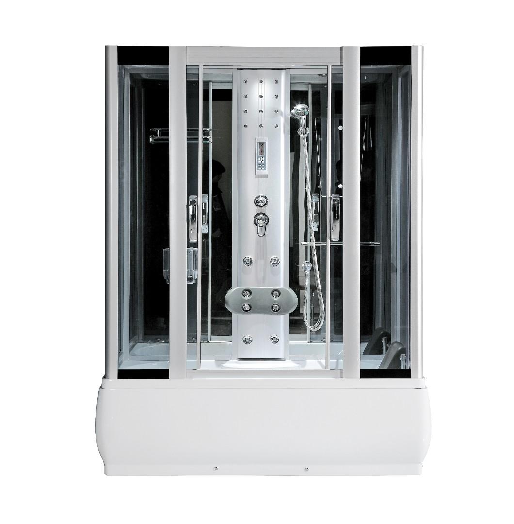 Прямоугольная гидромассажная душевая кабина с высоким поддоном с сиденьем.