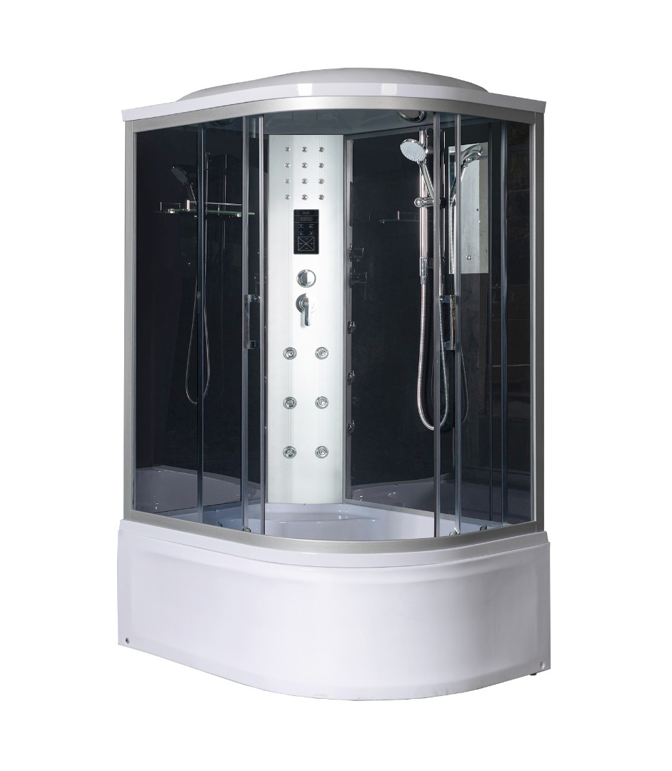 Кабина с гидромассажем. Задние стенки из тёмного закалённого стекла, двери – тонированные на магнитном уплотнителе. Модель упрощённой безсиликоной сборки с высокой гидроизоляцией.