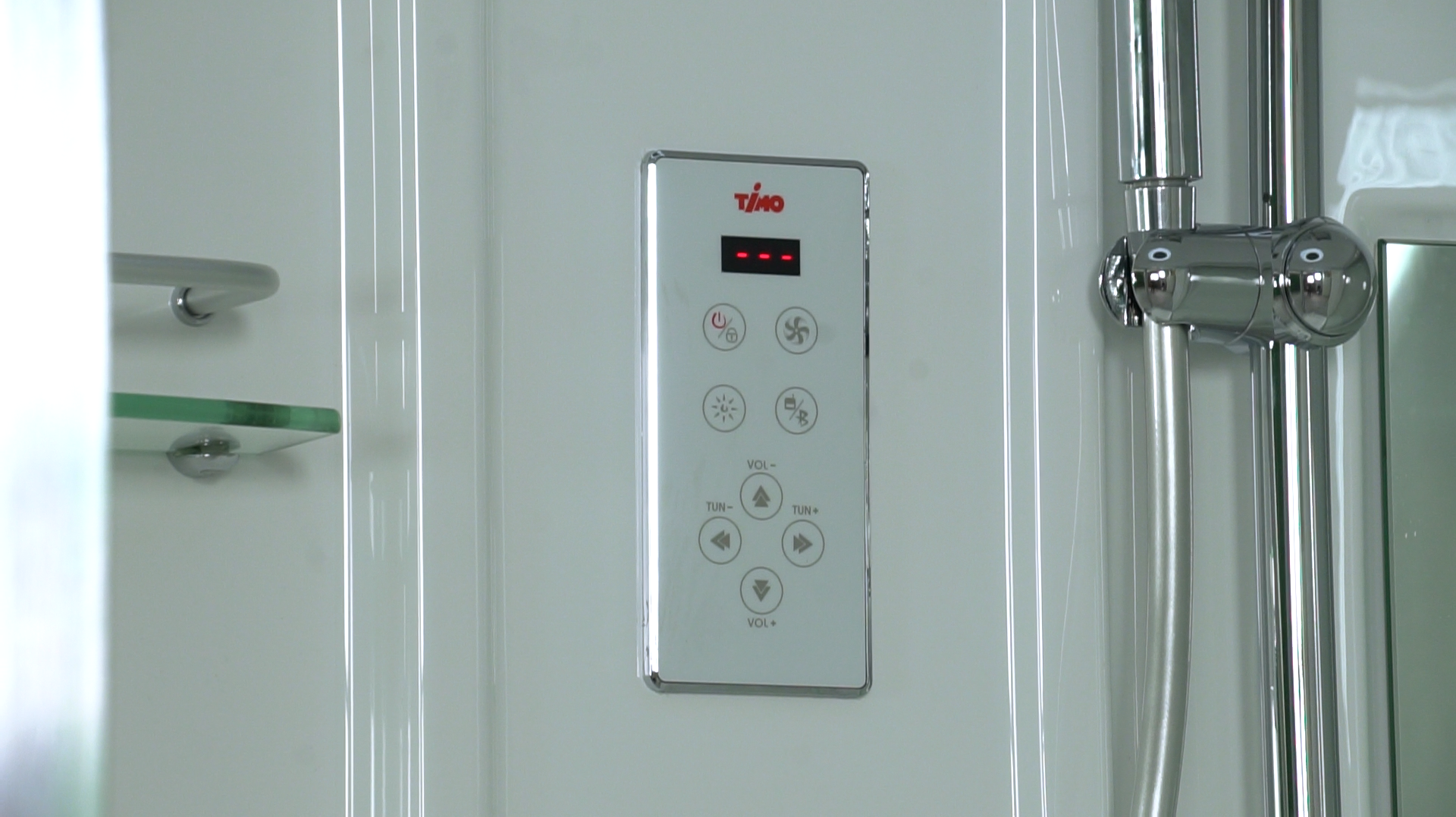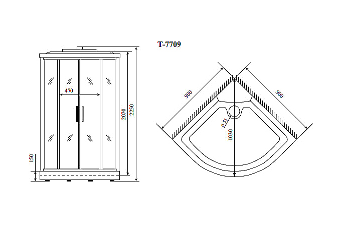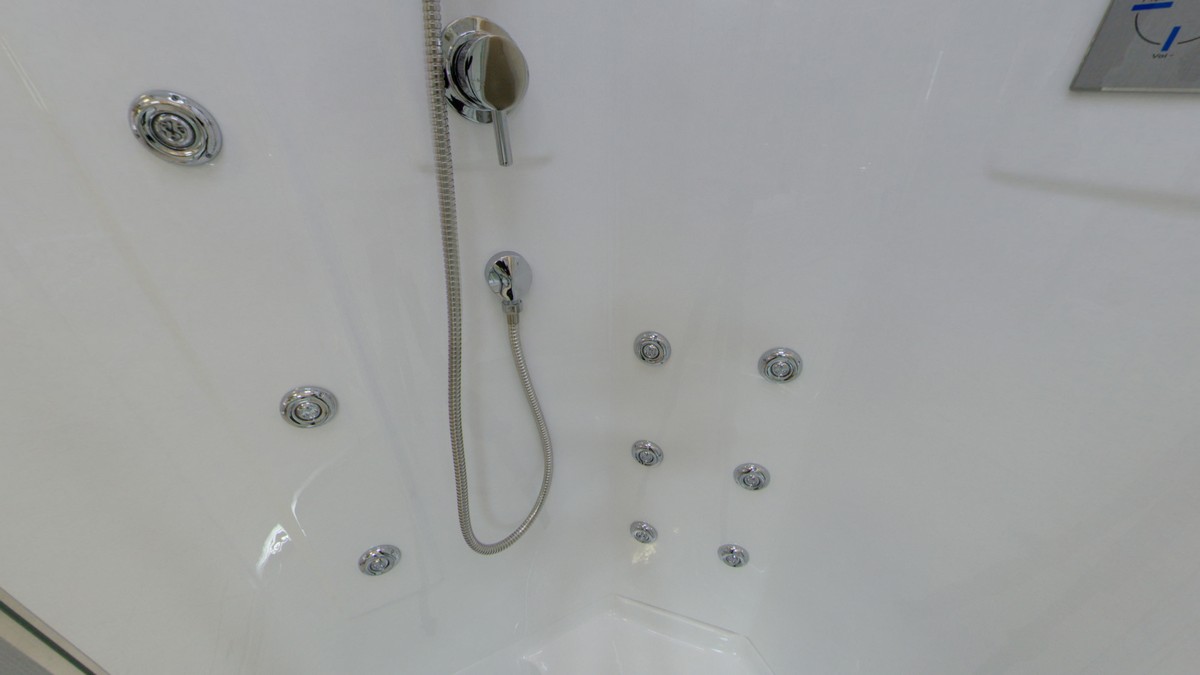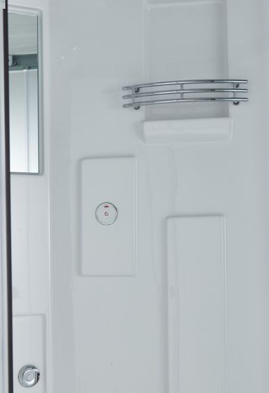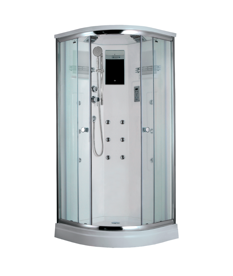 Душевая кабина с поддоном в форме четверти круга предназначена для установки в угол помещения. Система гидромассажа представлена 6 форсунками для спинного массажа и 6 форсунками для массажа тела в стоячем положении, которые расположены на задних стенках кабины. На центральной части задника расположено зеркало, четырёхрежимный переключатель, хромированный смеситель. Сенсорный пульт управления предназначен для включения радиоприёмника, подсветки и вентиляции, регулировки громкости радио.