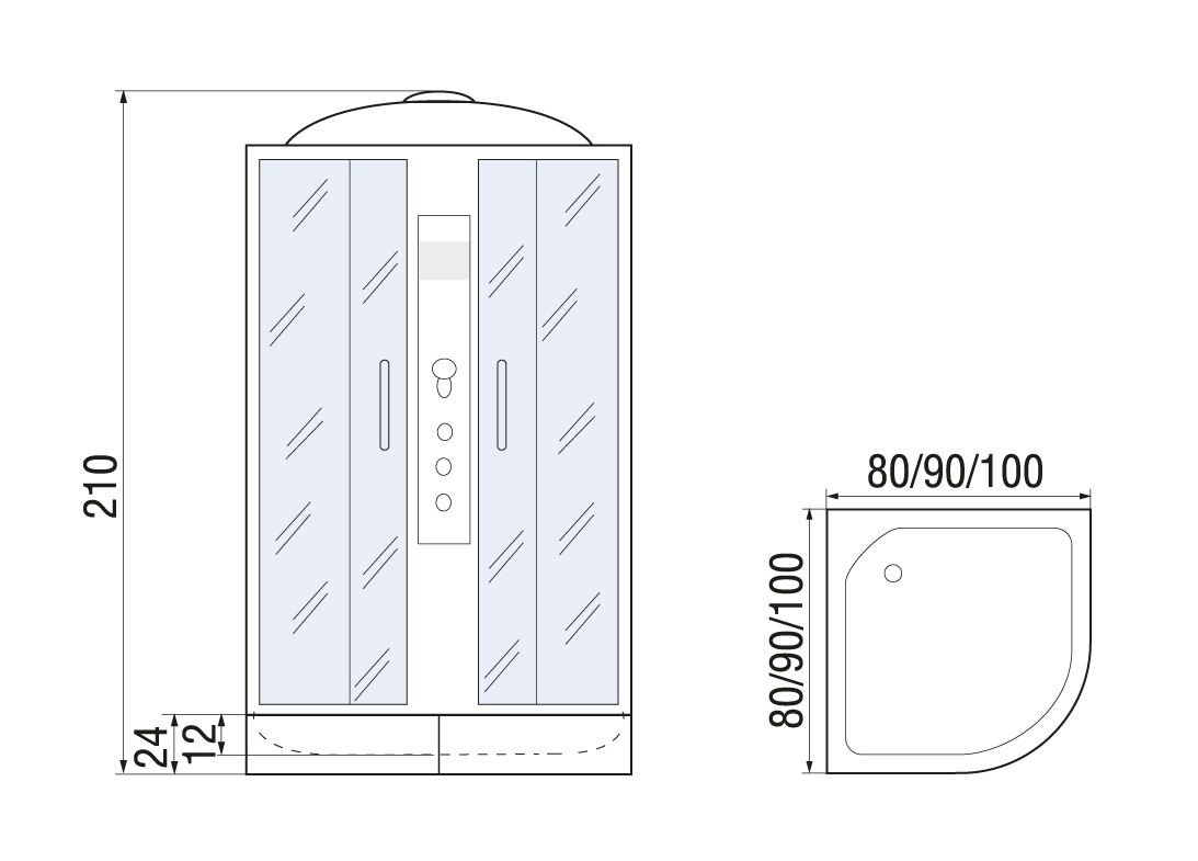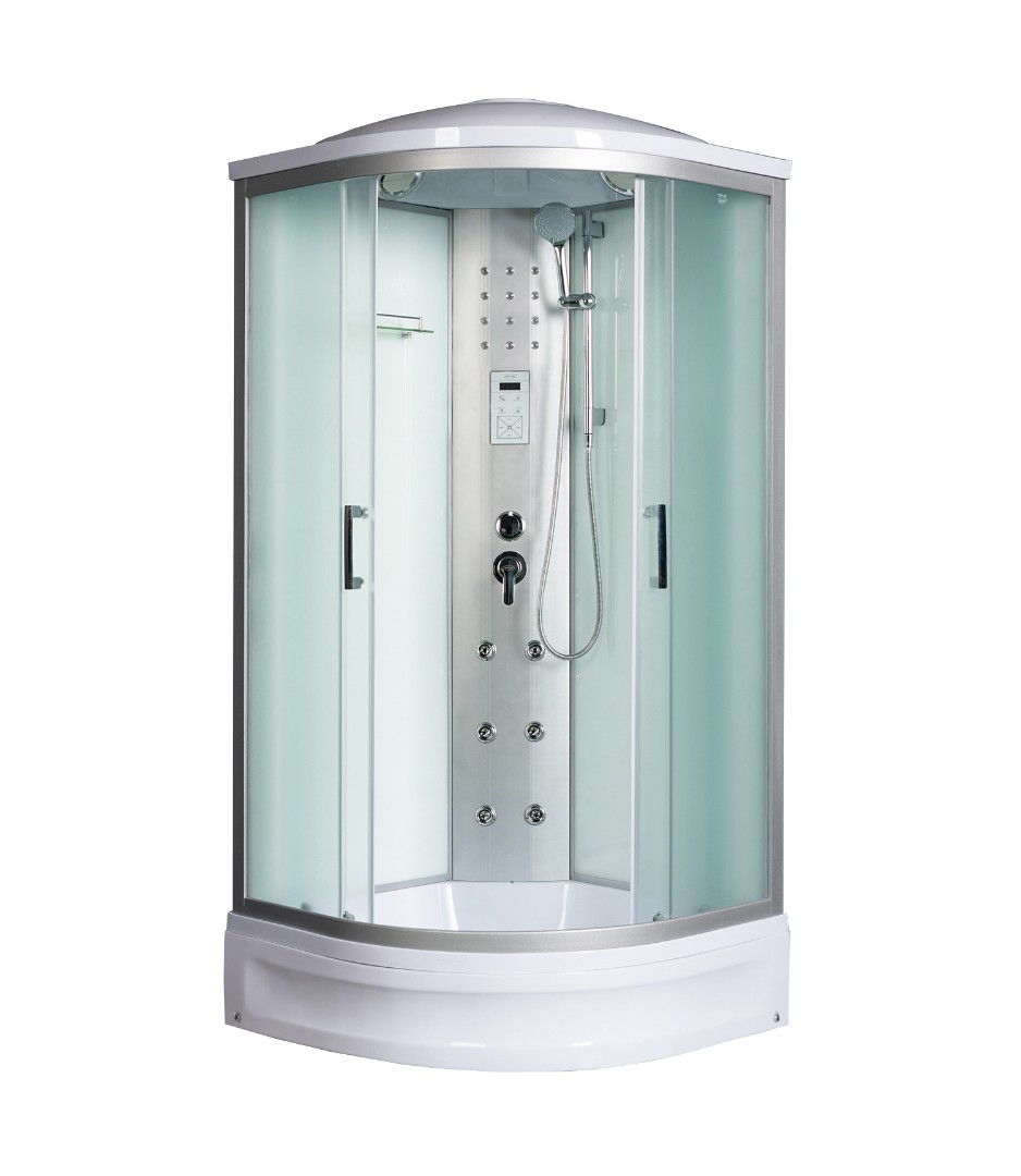 Комплектация: крыша, верхний душ, верхний свет, динамик, вентилятор, центральная стойка, пульт управления, радио, телефон, смеситель с переключением режимов, гидромассажные форсунки (6 шт), штанга, ручной душ 3-х режимный, зеркало, полочка, поддон, сифон.