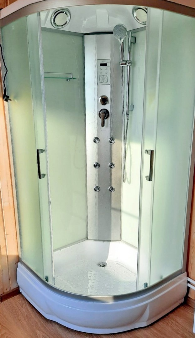 Кабина с гидромассажем, сенсорным управлением и освещением. Вентиляция предупреждает размножение грибка.