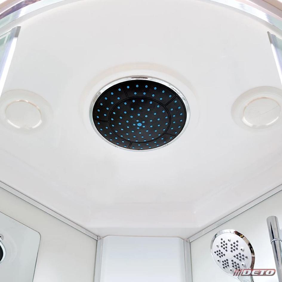Качественная и надёжная душевая кабина Deto EM1580 изготовлена в форме четверти круга с радиусом 80 см. Такая форма предполагает расположение в углу ванной комнаты. Быстро выполнить установку кабины помогают определённые конструктивные особенности: сборка изнутри, без использования герметика, резьбовые соединения шлангов, регулируемые по высоте ножки каркаса.