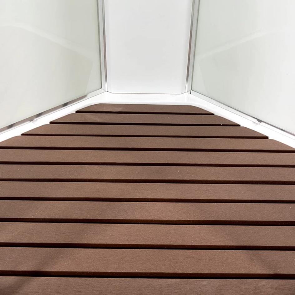 Сама кабина имеет небольшие габаритные размеры 90 на 90 см, но за счёт формы в виде четверти круга вполне просторна внутри.