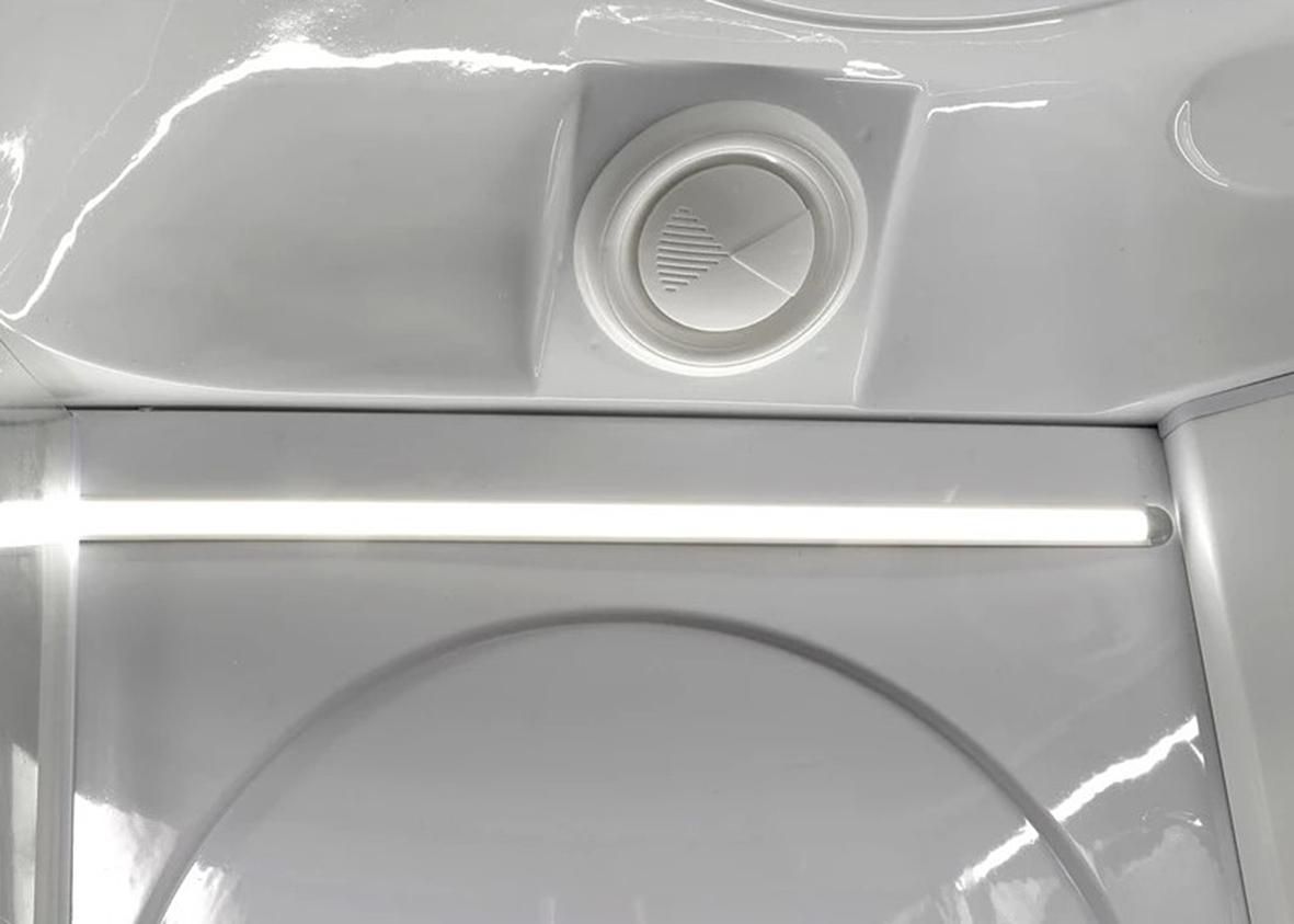 Небольшая Душевая кабина Deto L580LED+GM позволит быстро и качественно организовать уютное и многофункциональное душевое пространство в Вашей ванной комнате. Кабина представляет собой четверть круга с радиусом 80 см. В комплекте имеется литой акриловый поддон, который устанавливается на металлический каркас с регулируемыми по высоте ножками, и крыша. В неё вмонтирована лейка тропического душа и радиодинамики. Также сделаны отверстия для функционирования принудительной вентиляции. Верхняя подсветка реализована в виде светодиодной ленты вдоль задних стенок, которые изготовлены из абс-пластика.