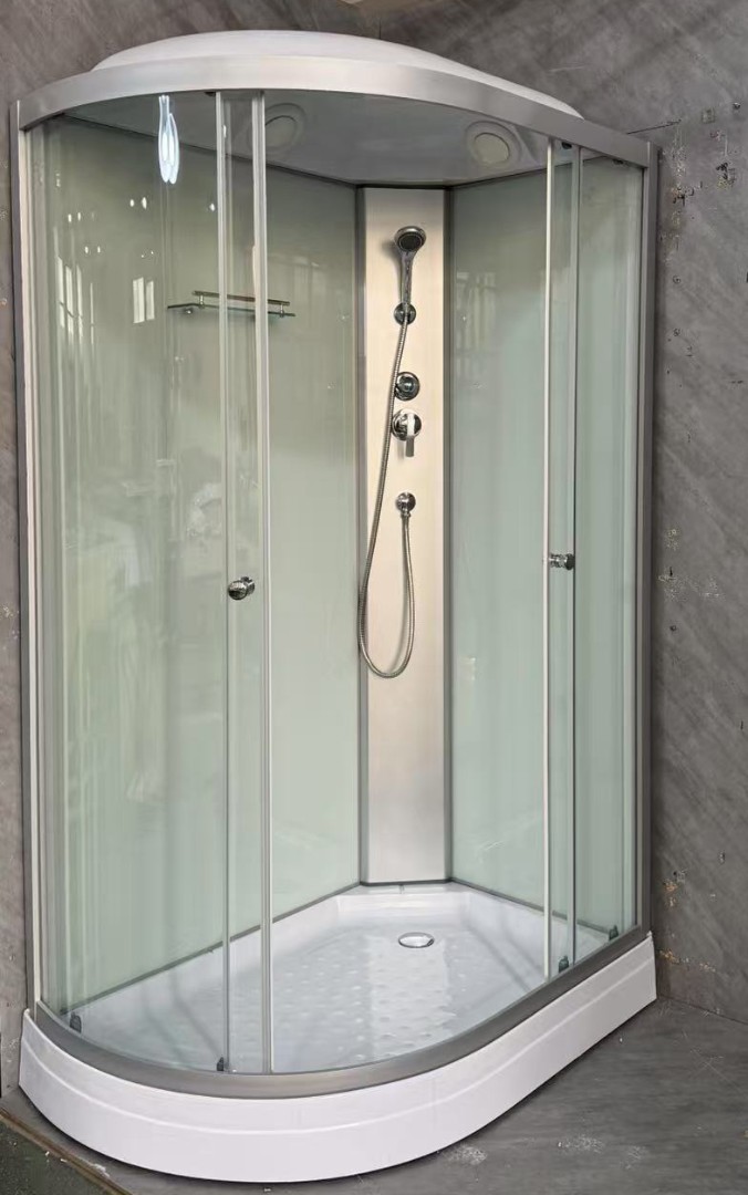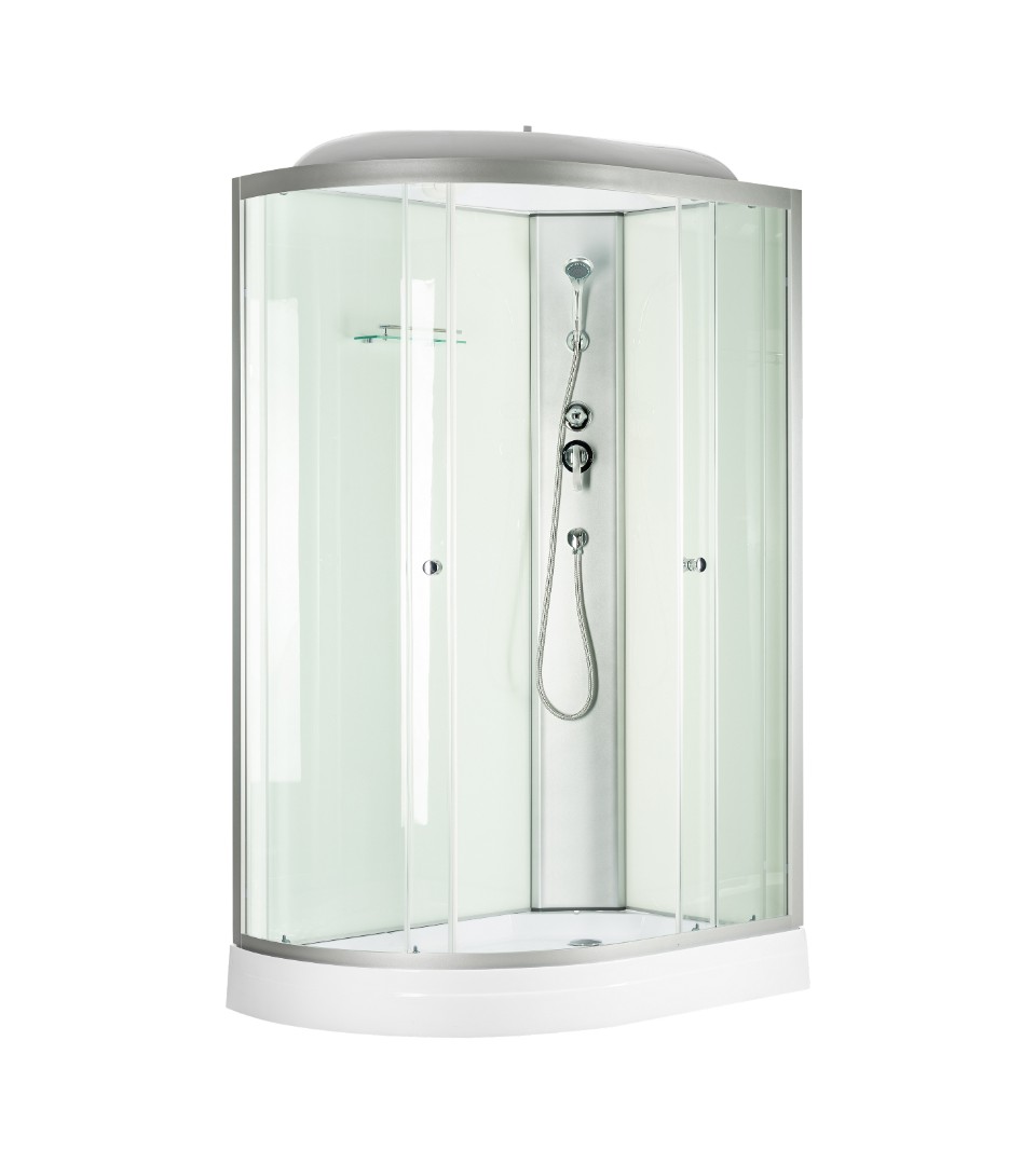 Душевая кабина Saniteco BST-120W закрытого типа с прозрачными передними стёклами и белыми задними стенками.