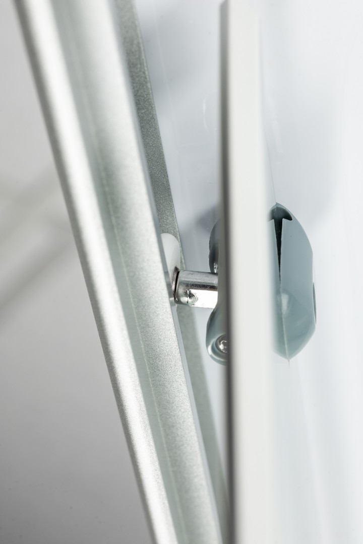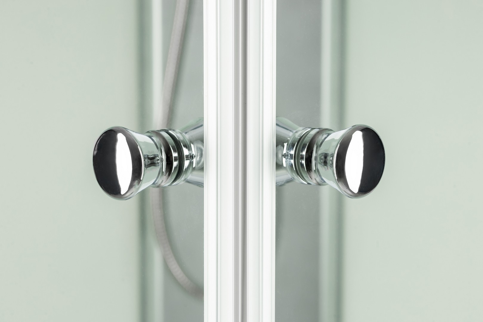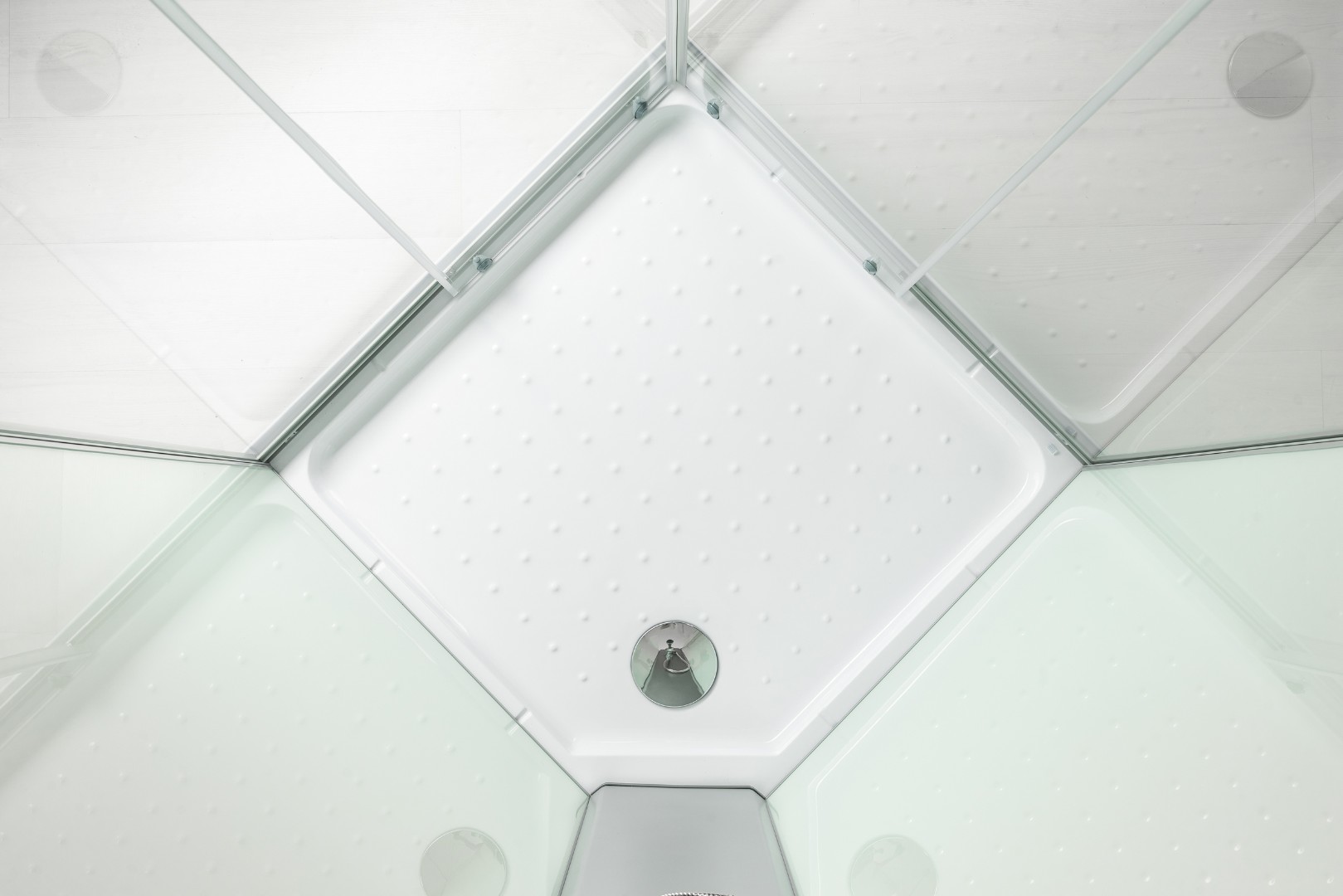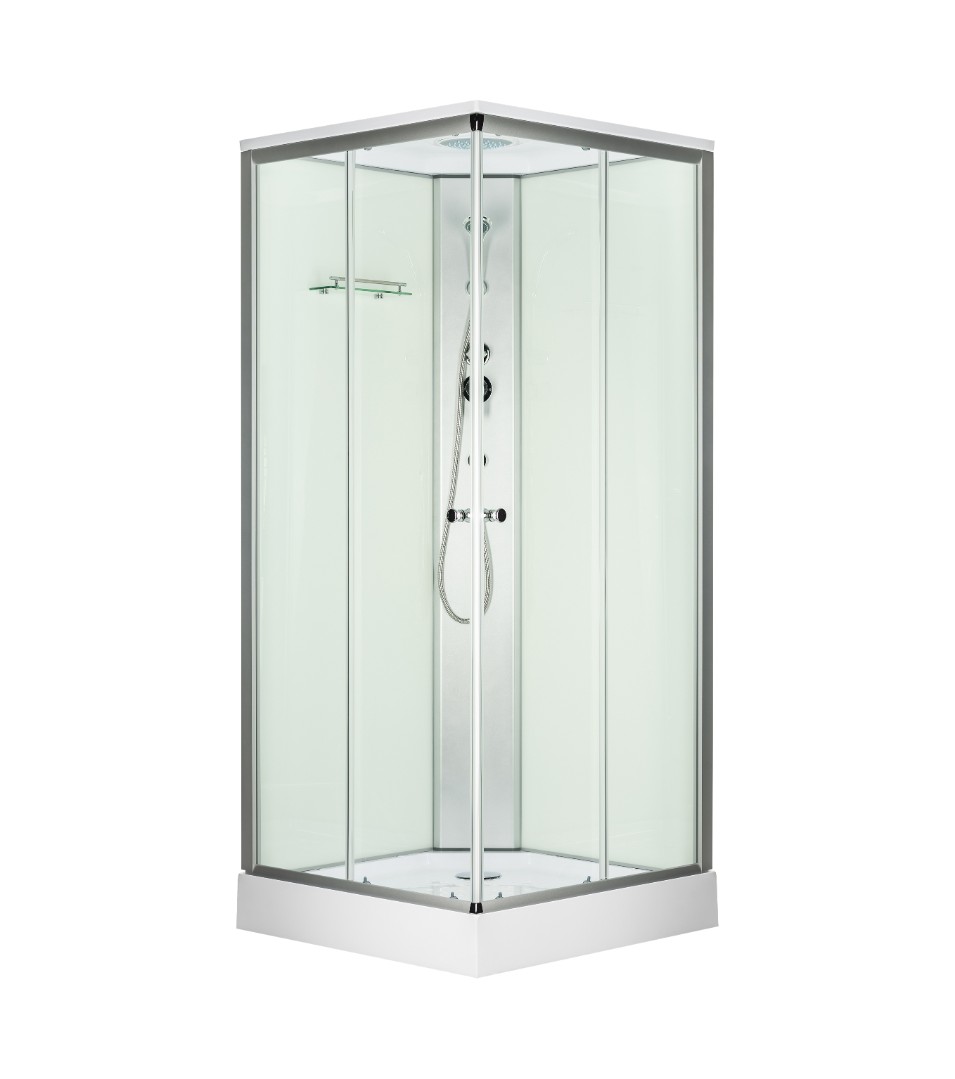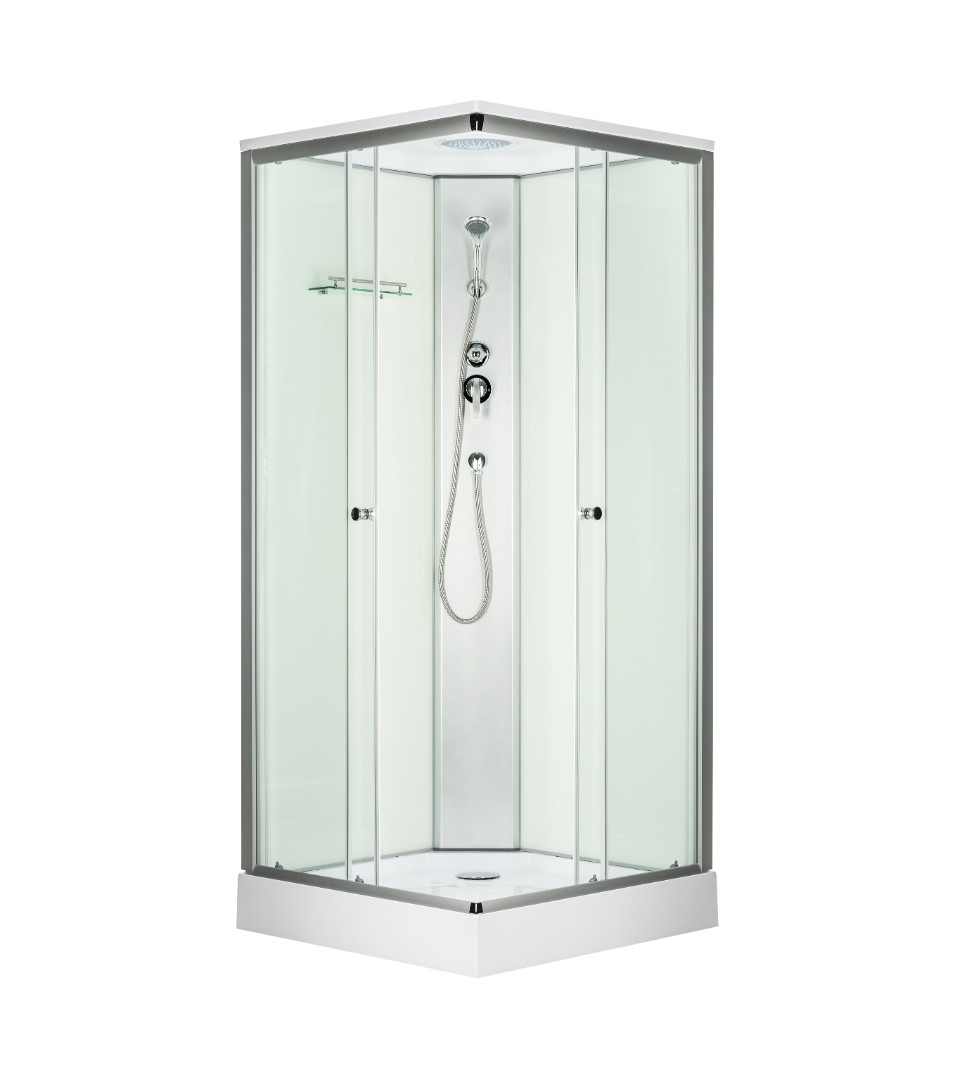 Душевая кабина Saniteco BST-280W закрытого типа с прозрачными передними стёклами и белыми задними стенками.