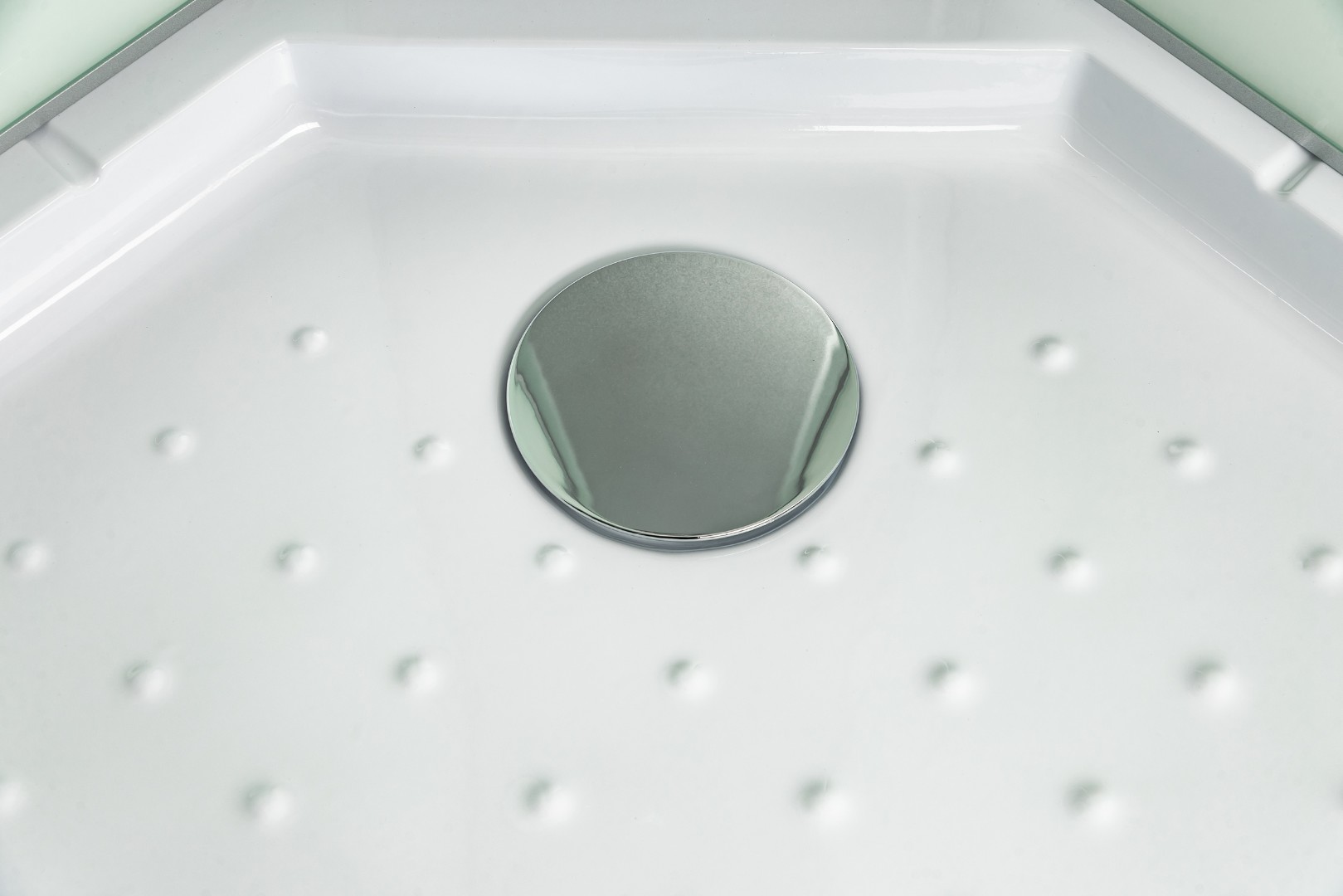 Душевая кабина Saniteco BST-290W закрытого типа с прозрачными передними стёклами и белыми задними стенками.