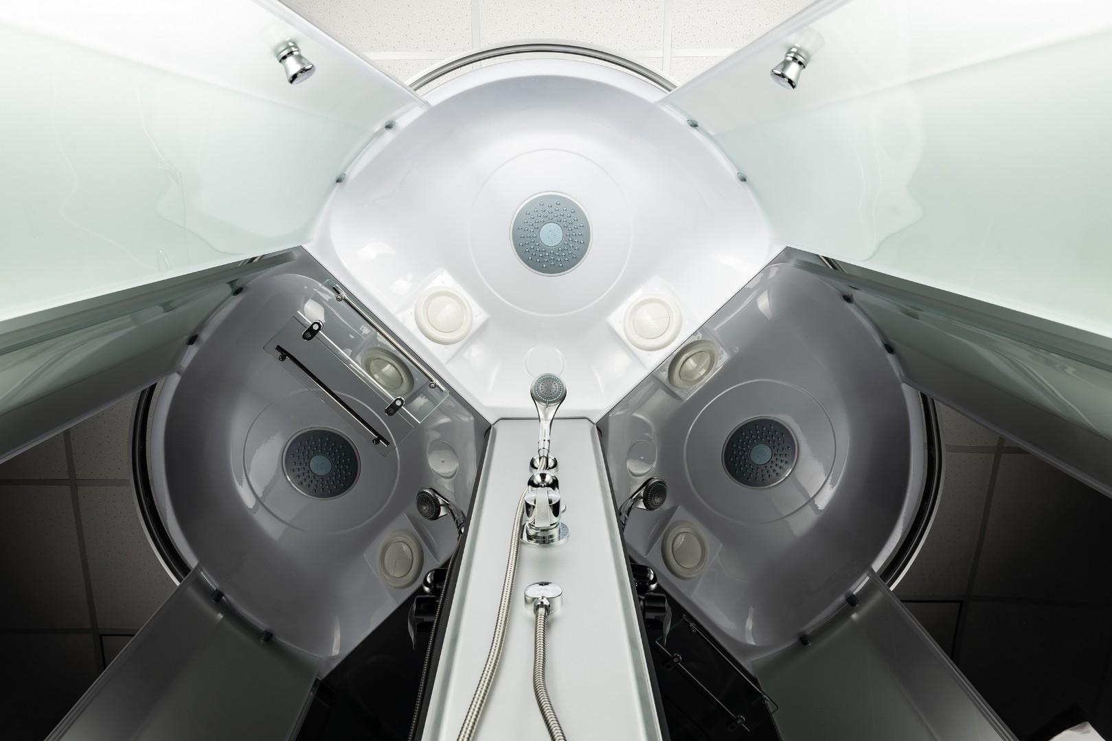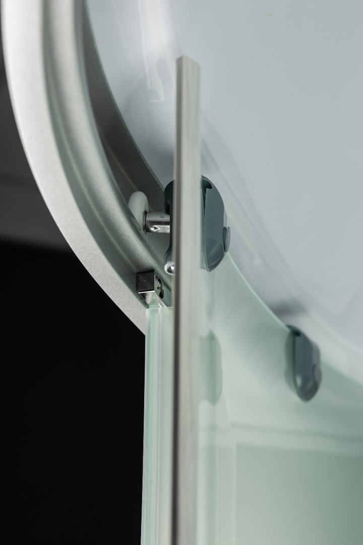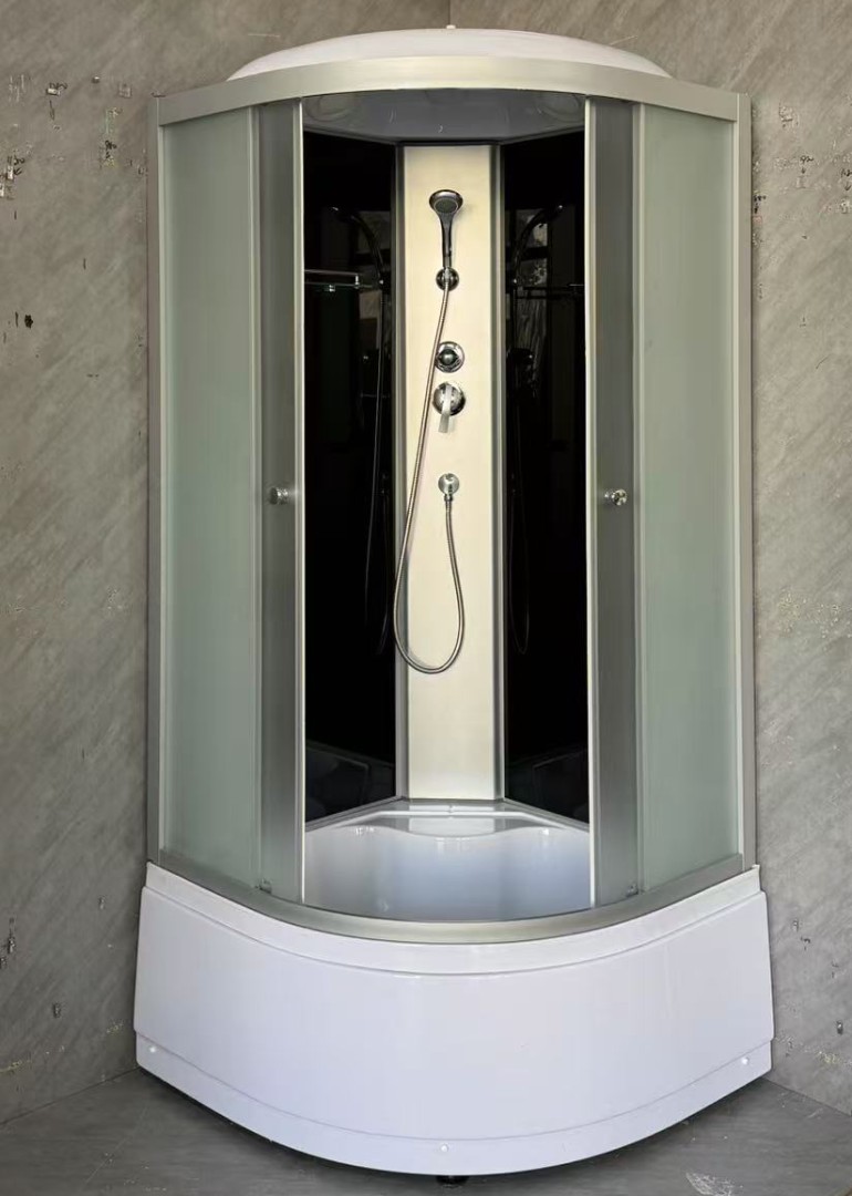Душевая кабина Saniteco BST-80B закрытого типа с матовыми передними стёклами и чёрными задними стенками.