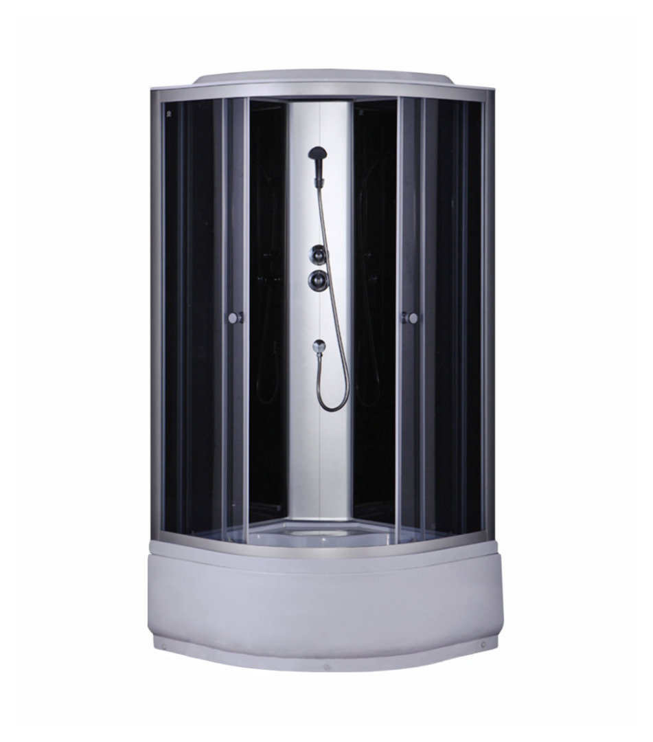 Душевая кабина Saniteco SN-80B закрытого типа с тонированными передними стёклами и черными задними стенками.
