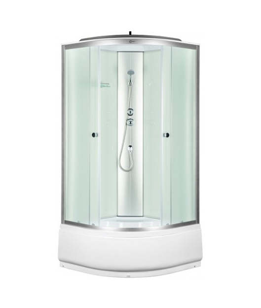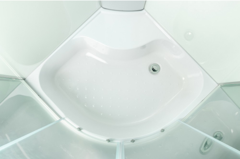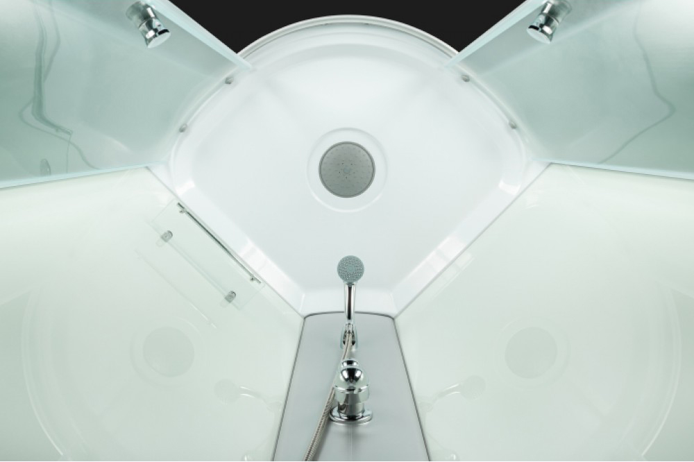 Душевая кабина Saniteco SN-80W закрытого типа с прозрачными передними стёклами и белыми задними стенками.