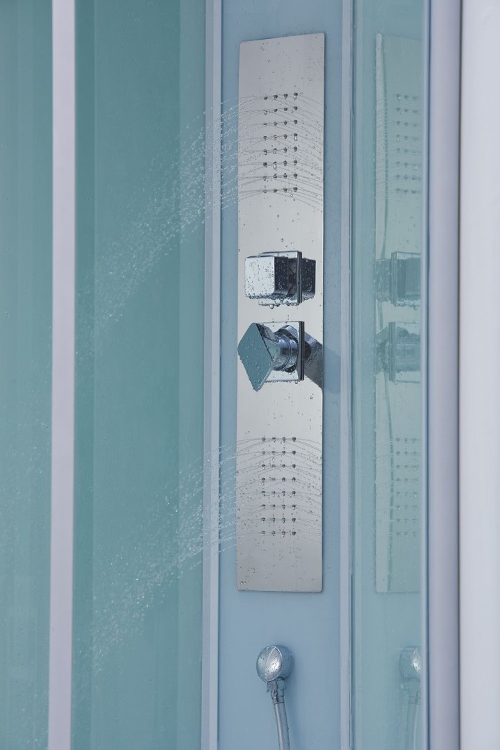- Центральная панель – белое стекло с накладкой из нержавеющей стали с силиконовыми форсунками и смесителем из латуни.
