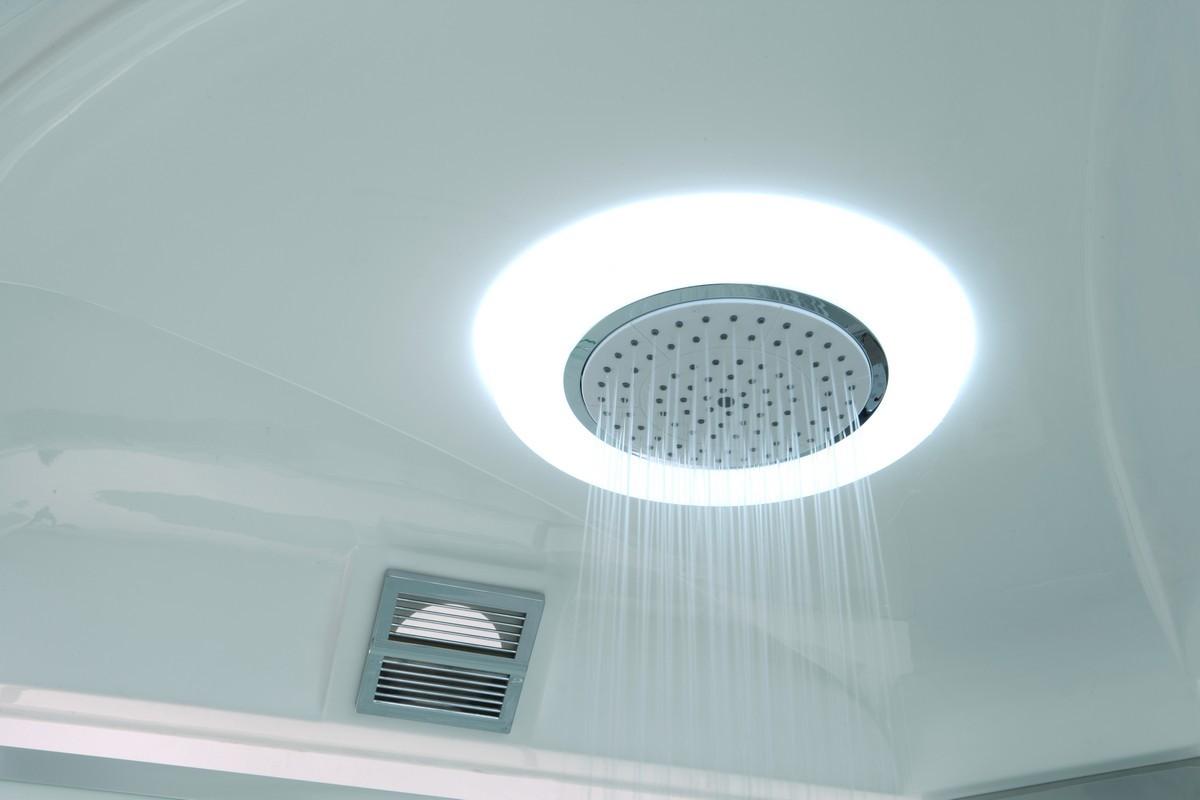 Модель оснащена верхним, каскадным и ручной лейкой душем, гидромассажем спины. Внутри есть полочка, откидное сиденье, штанга с регулировкой по высоте.