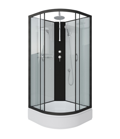 - Профиль выполнен в чёрном варианте, стенки и двери кабины - белые матовые. Центральная панель пластиковая чёрного цвета, на ней установлен смеситель с переключателем режимов.