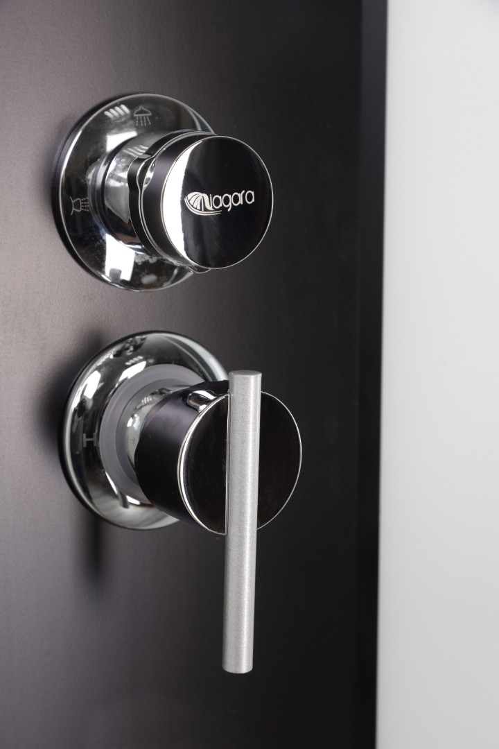- Профиль выполнен в чёрном варианте, стенки и двери кабины - белые матовые. Центральная панель пластиковая чёрного цвета, на ней установлен смеситель с переключателем режимов.