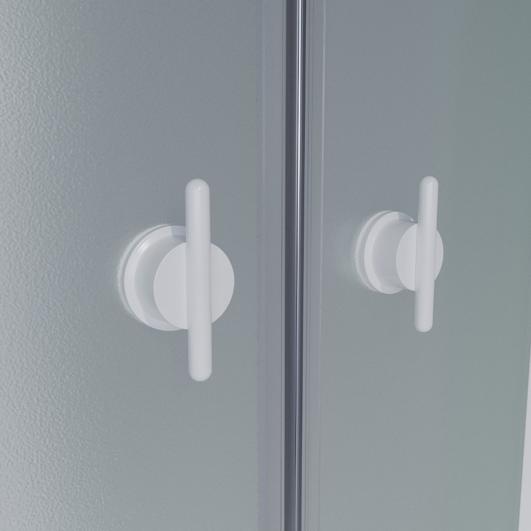 Двери и передние неподвижные стенки сделаны из калёного стекла, матовые, двери передвигаются на одинарных роликах, по профилю.
