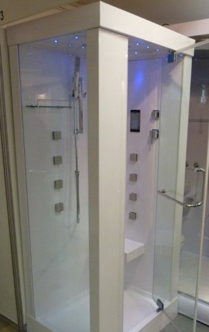 Крадратная гидромассажная душевая кабина для пристенного монтажа. Закалённое травмобезопасное стекло 6 мм. Акриловый поддон, армированный стекловолокном.