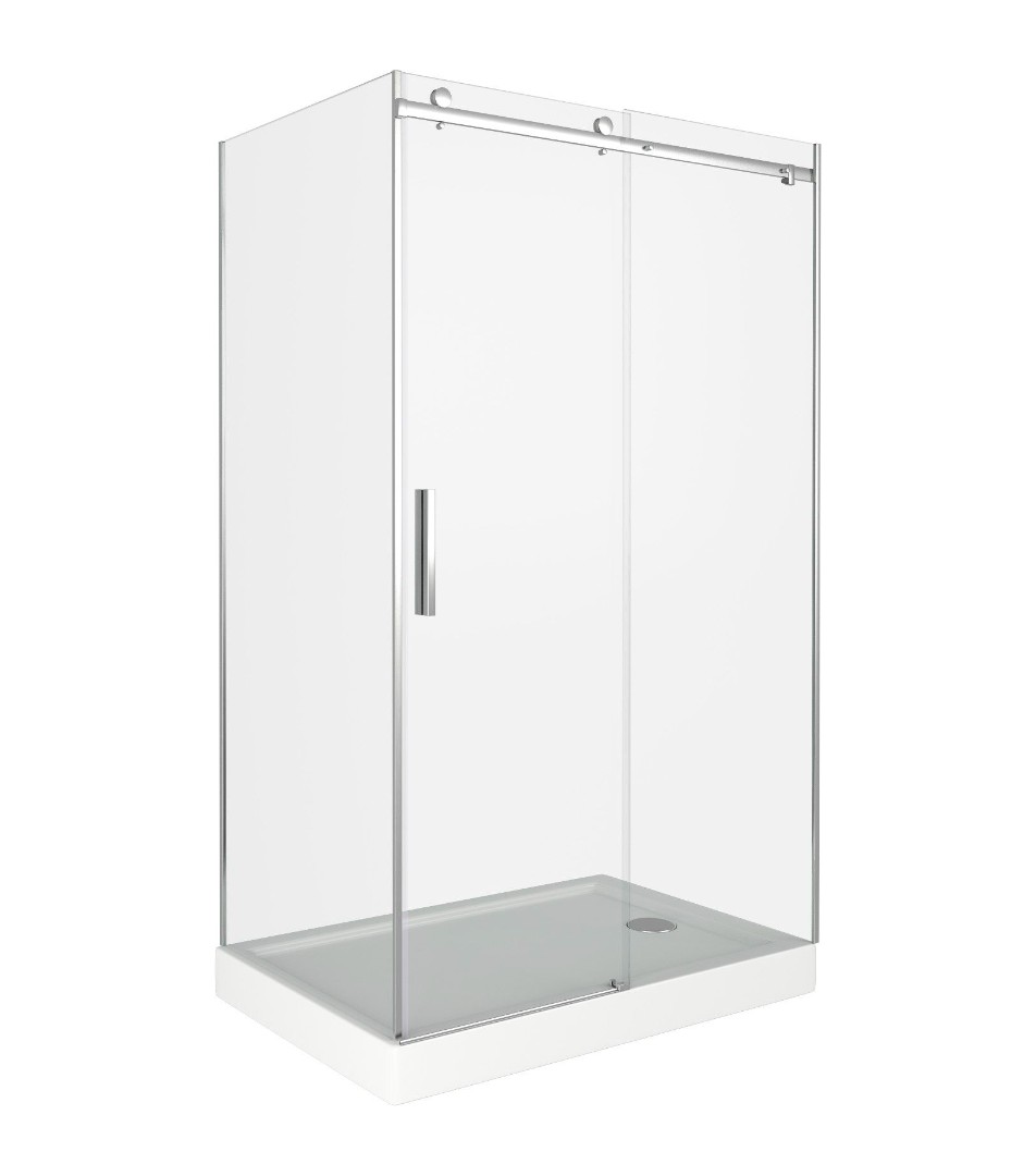 Прямоугольный душевой уголок с раздвижной дверью в комплекте с боковой стенкой.