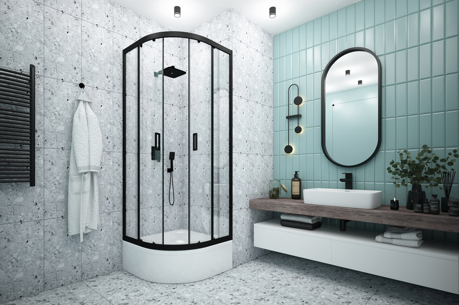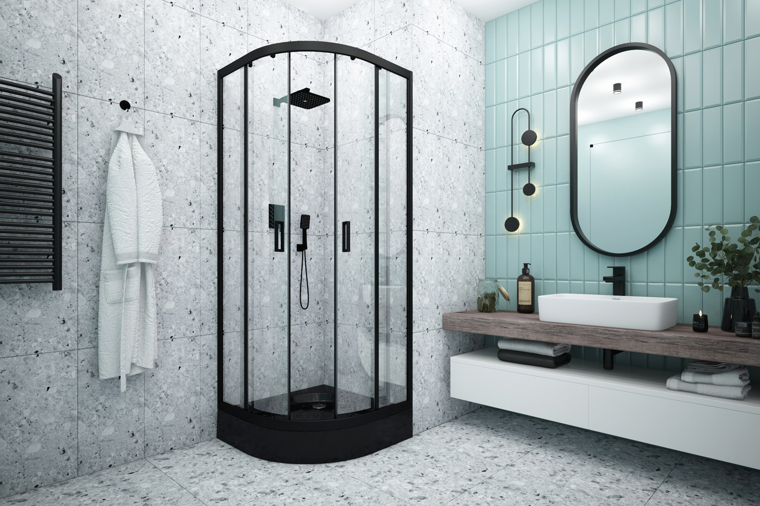Душевые ограждения в чёрном цвете вносят в интерьер современность, стиль и элегантность. Чёрные изделия гармонично сочетаются с любыми цветовыми решениями ванной комнаты, а также выглядят феноменально на фоне контрастных оттенков, например, светлой плитки, натурального дерева и т.п.