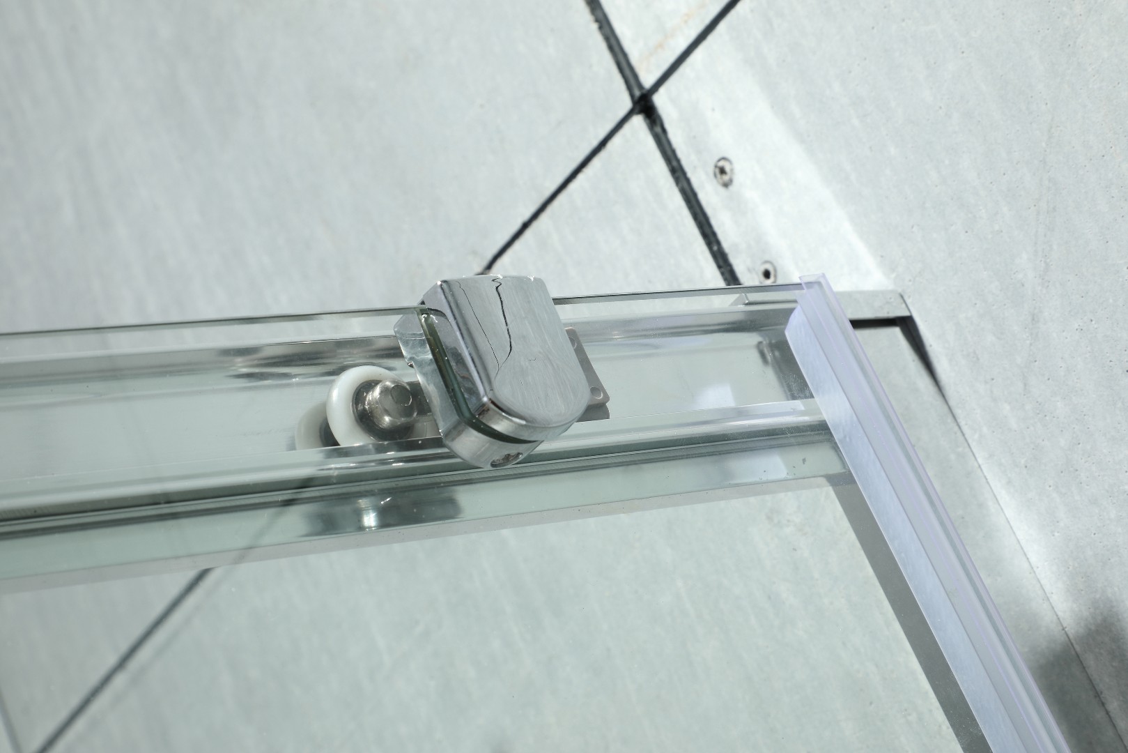- надёжные двойные ролики двигаются бесшумно, обеспечивают плавный ход дверей, конструктивно защищены от попадания воды;