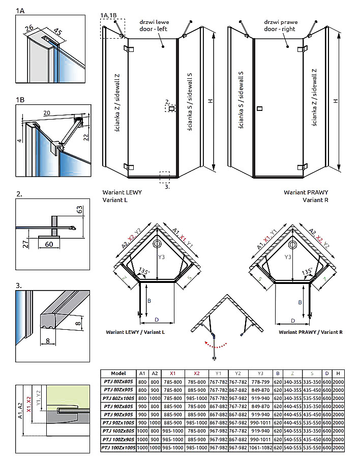 Radaway Essenza PTJ – это сборный душевой уголок, который состоит из распашной двери PTJ и комплекта неподвижных стенок Z.