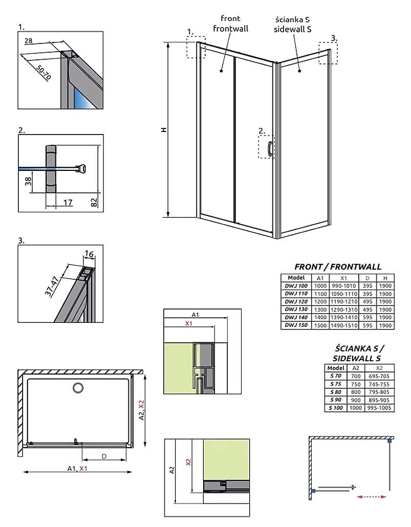 - Стекло крепится к стене с помощью пристенных профилей (с регулировкой, позволяет нивелировать неровность стен до 10 мм с каждой стороны).