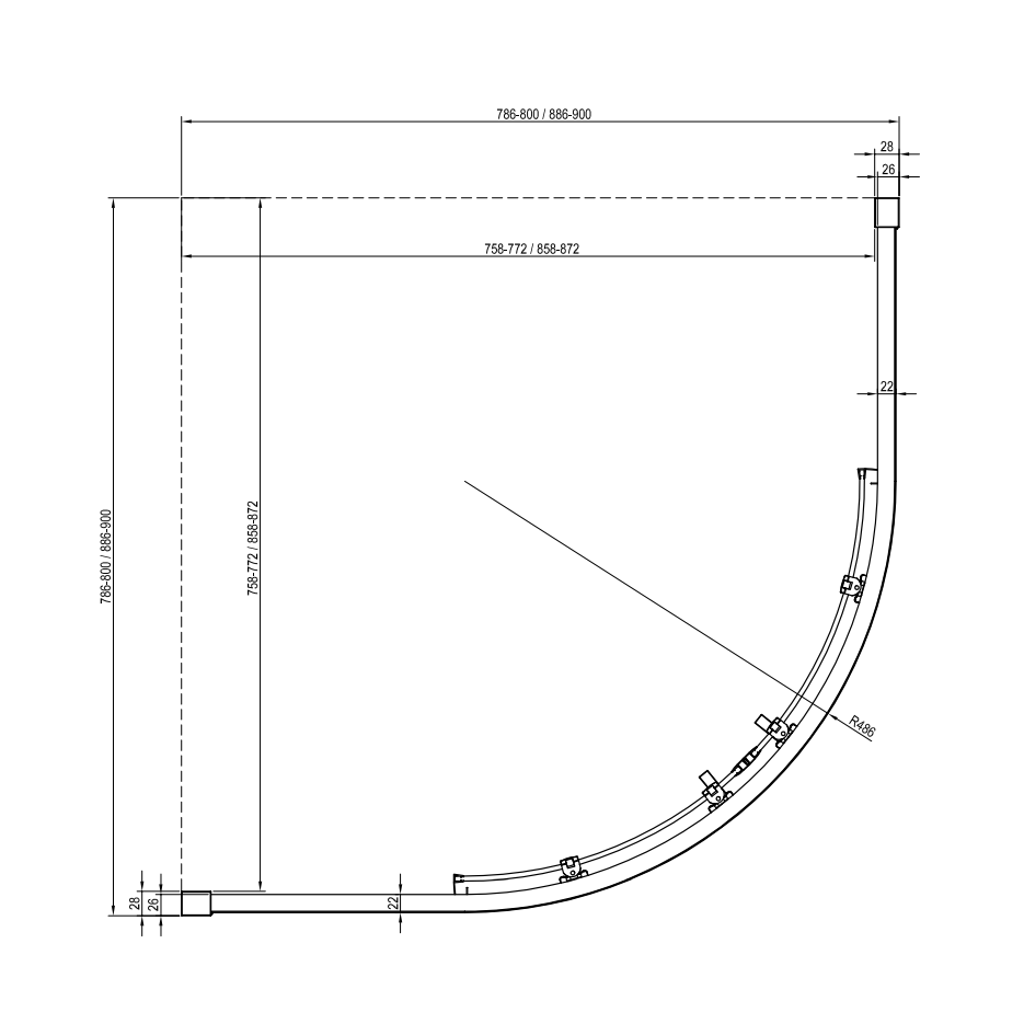 Изделие состоит из двух неподвижных прямых частей и двух изогнутых частей в виде раздвижной двери. Монтируется в облицованном углу ванной комнаты на душевые поддоны RAVAK Ronda, Elipso, Elipso Pro, Elipso Pro Flat, Elipso Pro Chrome или непосредственно на пол со встроенным душевым каналом или трапом.