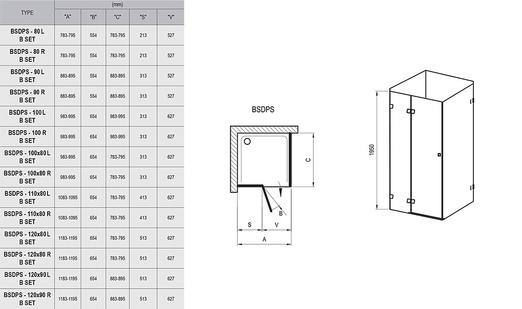 Душевой уголок BSDPS поставляется в составе: две стенки и одна дверь из безопасного стекла толщиной 8 мм и 6 мм соответственно, пороговая планка - в одной упаковке. Во второй упаковке (B SET) находятся петли, крепления, ручки, монтажный набор и верхние держатели, вид и количество которых зависит от размера изделия (для BSDPS 80/80, 90/90 – 1 длинный держатель, для BSDPS 100/100, 100/80, 110/80 – 1 длинный +1 короткий держатели, для BSDPS 120/80, 120/90 – 2 длинных держателя). Для BSDPS 80/80, 90/90 второй держатель можно приобрести за дополнительную плату.