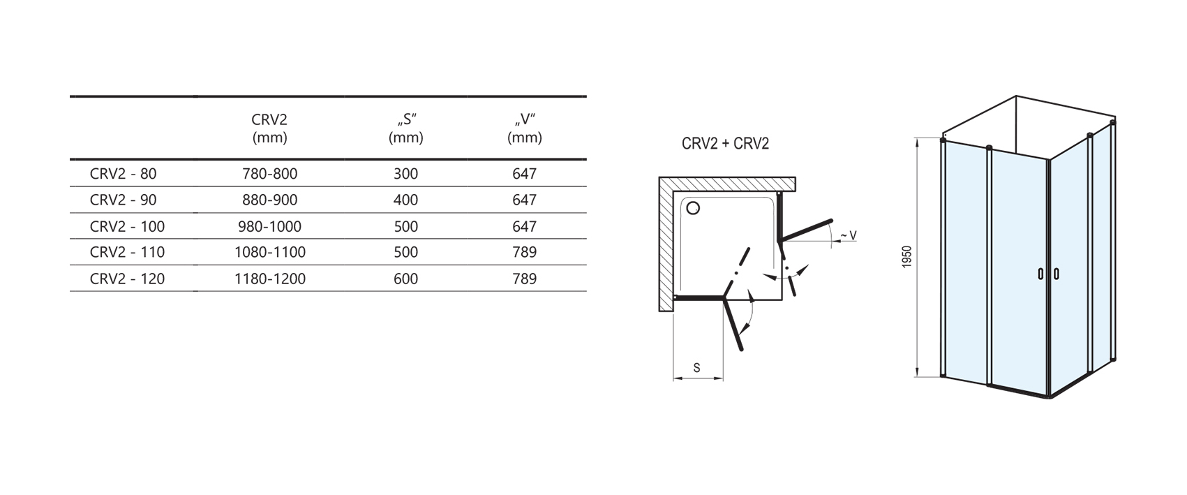 Скомбинировав два изделия CRV2, создайте квадратный или прямоугольный душевой уголок необходимых Вам размеров со входом.