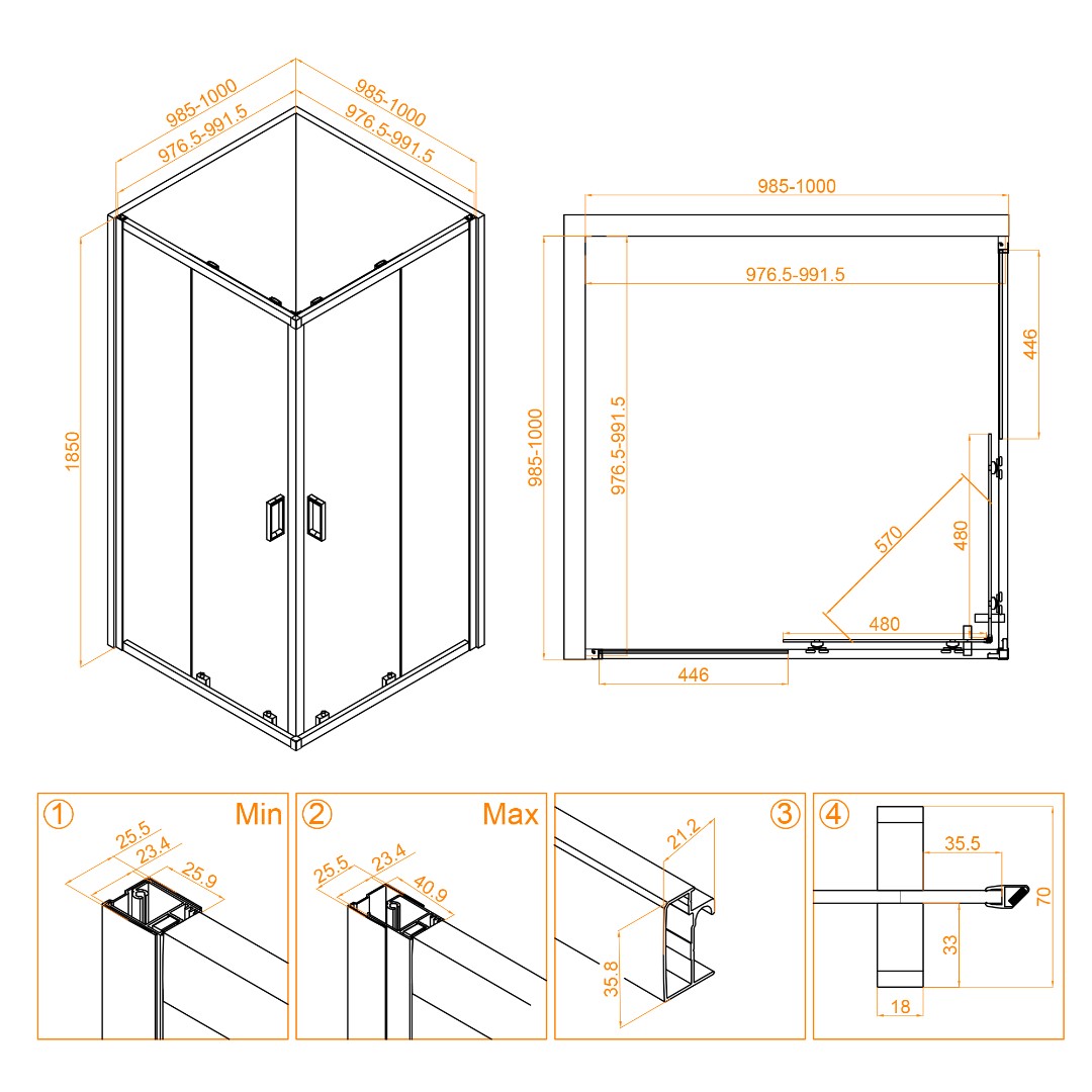 - Адаптивность к неровным стенам. Размеры с диапазоном регулировок: (985-1000)x(985-1000) мм.