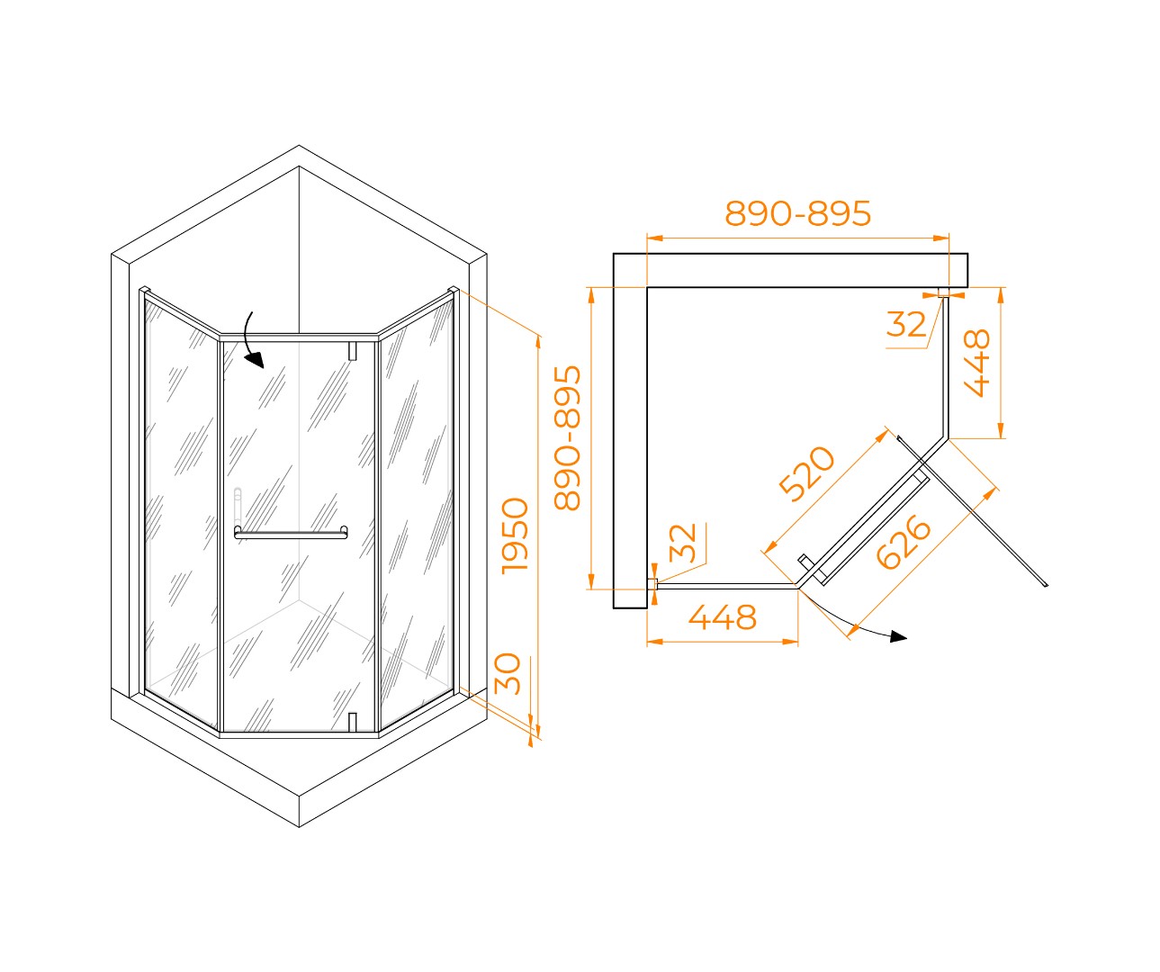 Душевой уголок трапеция с распашной дверью.