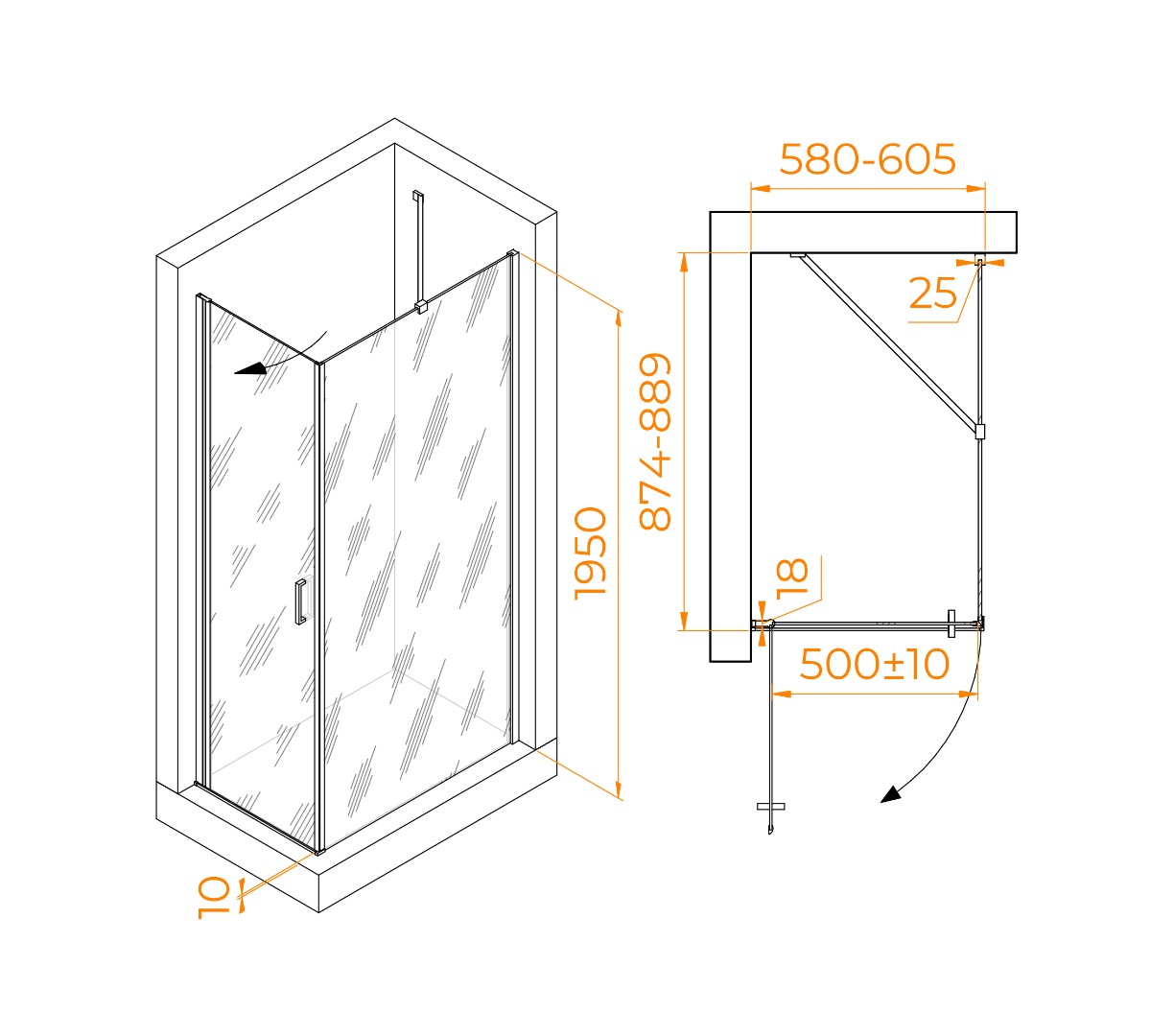 Душевой уголок состоит из распашной двери LE-003 и боковой стенки с кронштейном Z-14. Боковая стенка устанавливается со стороны открытия двери. В комплекте нижняя пороговая планка. Универсальная установка L/R.