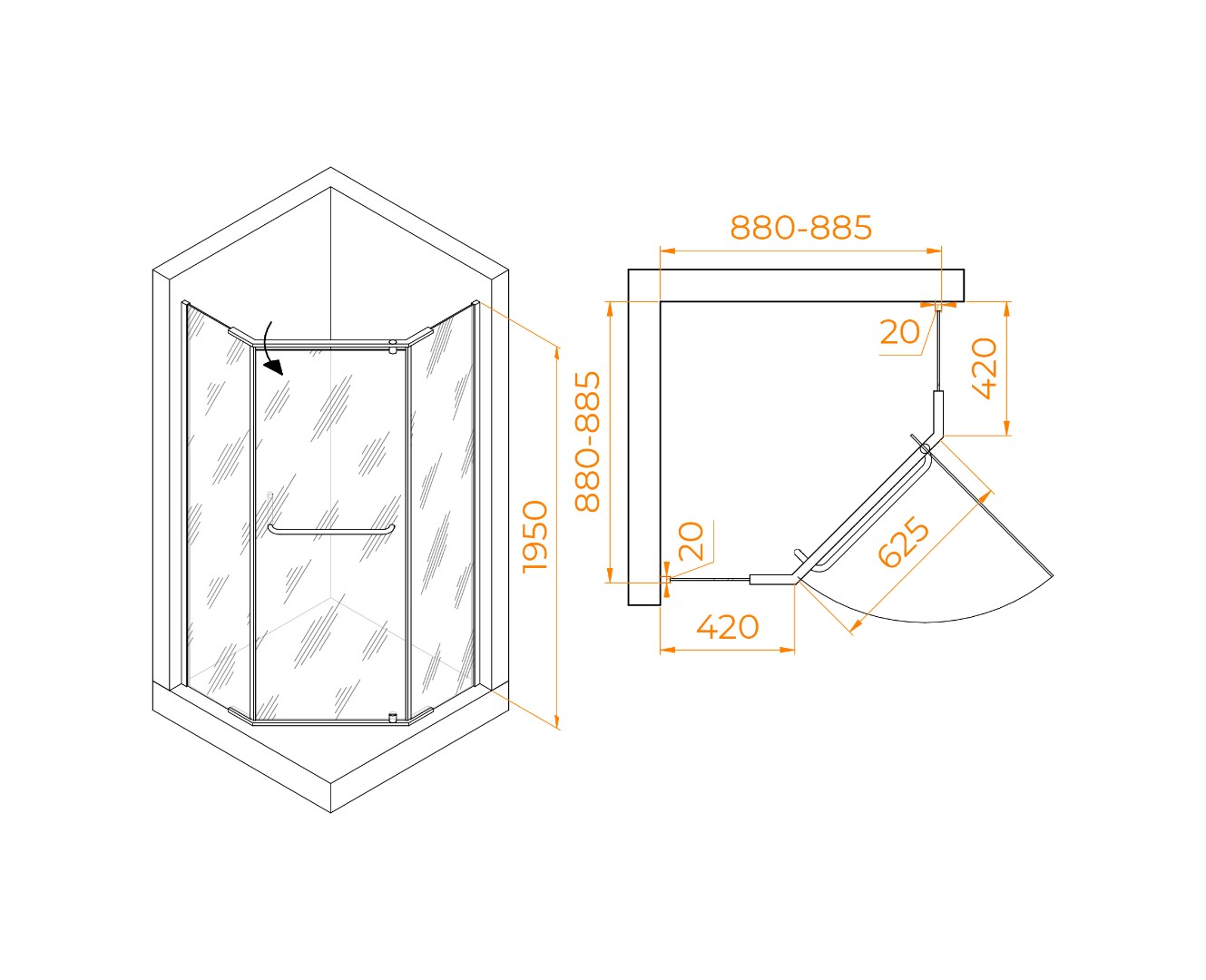 Душевой уголок трапеция с распашной дверью.