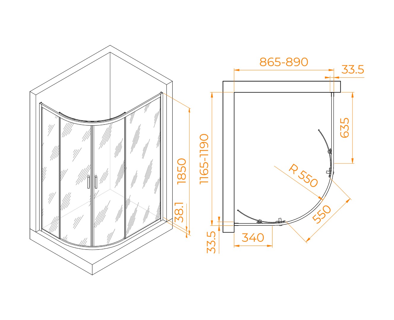 - Адаптивность к неровным стенам. Размеры с диапазоном регулировок: (865-890)-(1165-1190) мм.