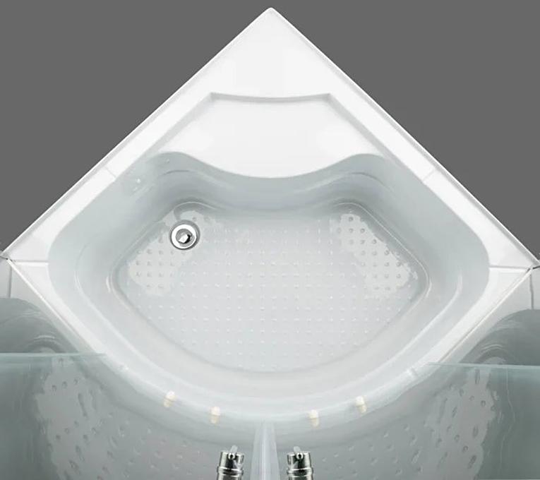 Классическая полукруглая модель с высоким поддоном. Поддон укреплён металлическим каркасом с регулируемыми ножками, сиденье отлито в поддоне. Безопасное закалённое стекло толщиной 4 мм.