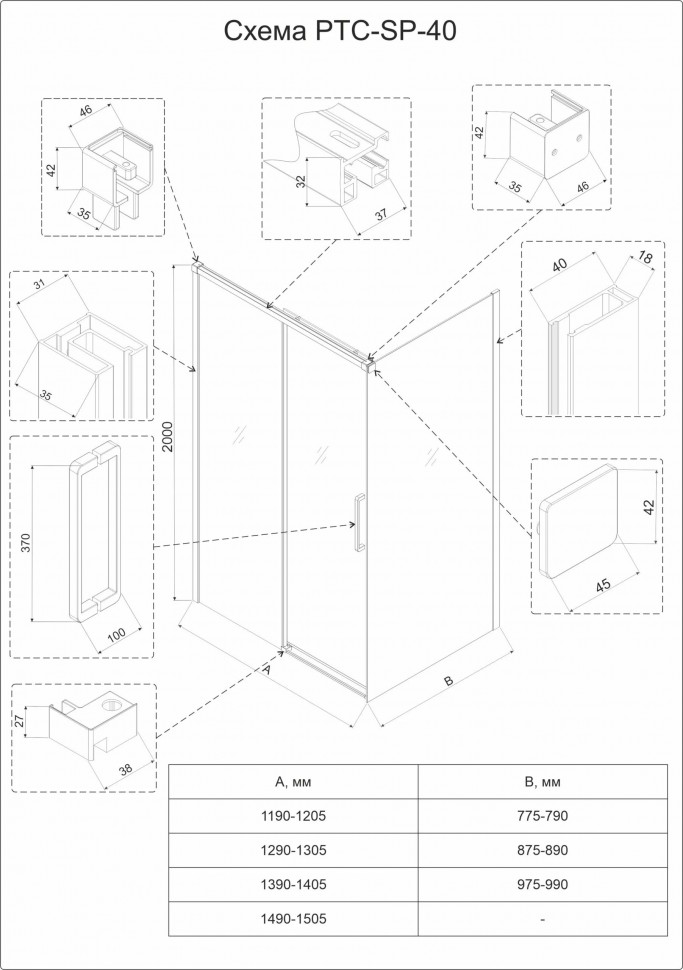 Душевой угол раздвижной. Модель состоит из раздвижной двери PTD-40GR и боковой панели SP-40GR.