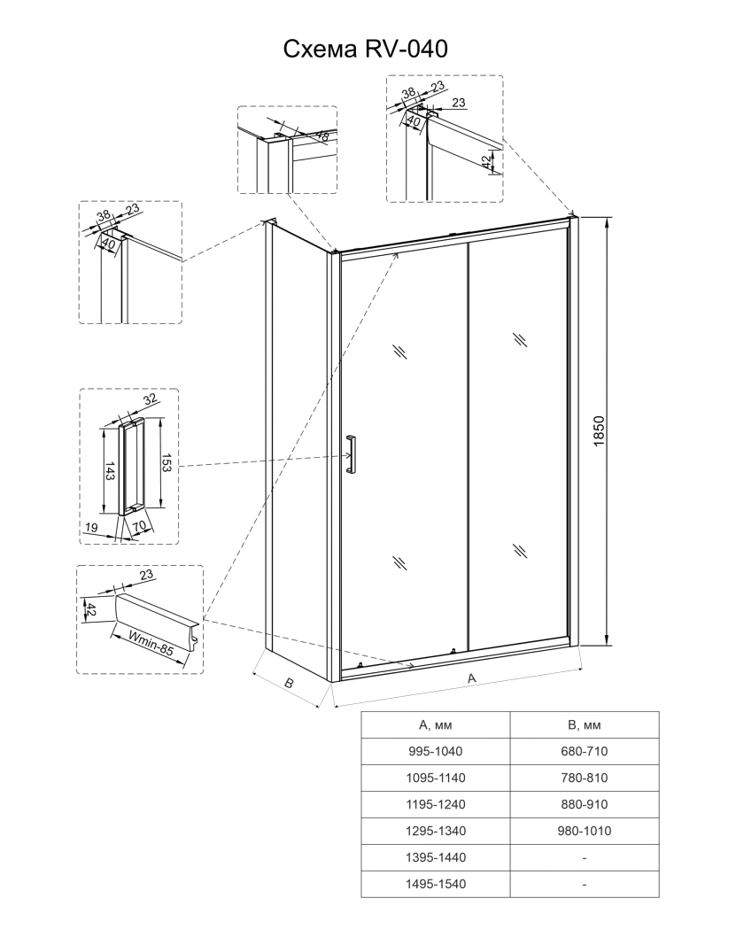 Душевой угол раздвижной прямоугольный. Данная модель состоит из раздвижной двери VN-40B и боковой панели KP-01B. Монтажный размер, мм: 995-1040х780-810.