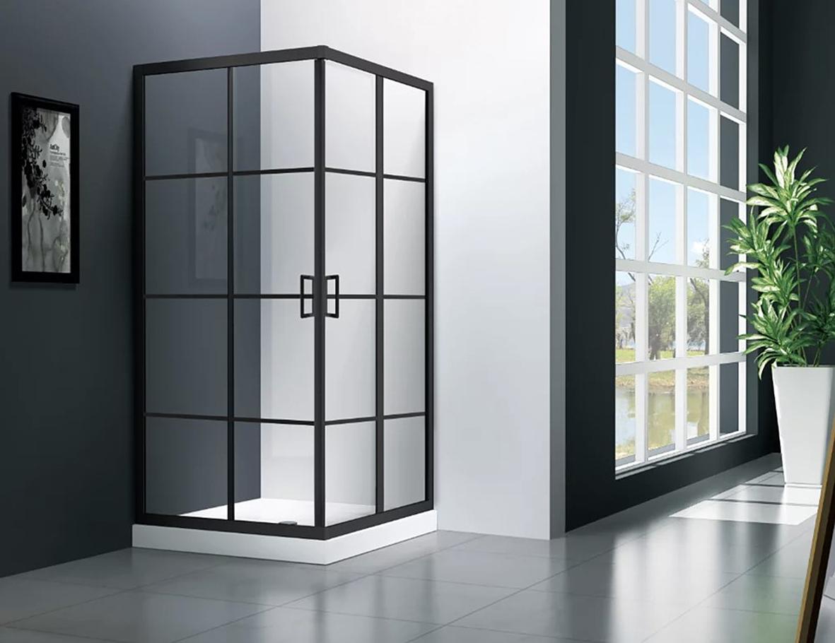 Квадратный душевой уголок. Две раздвижные двери из центра. Монтажный размер, мм: 980-1000х980-1000.