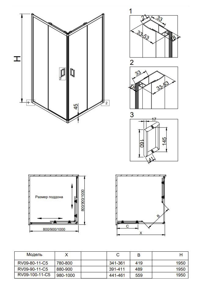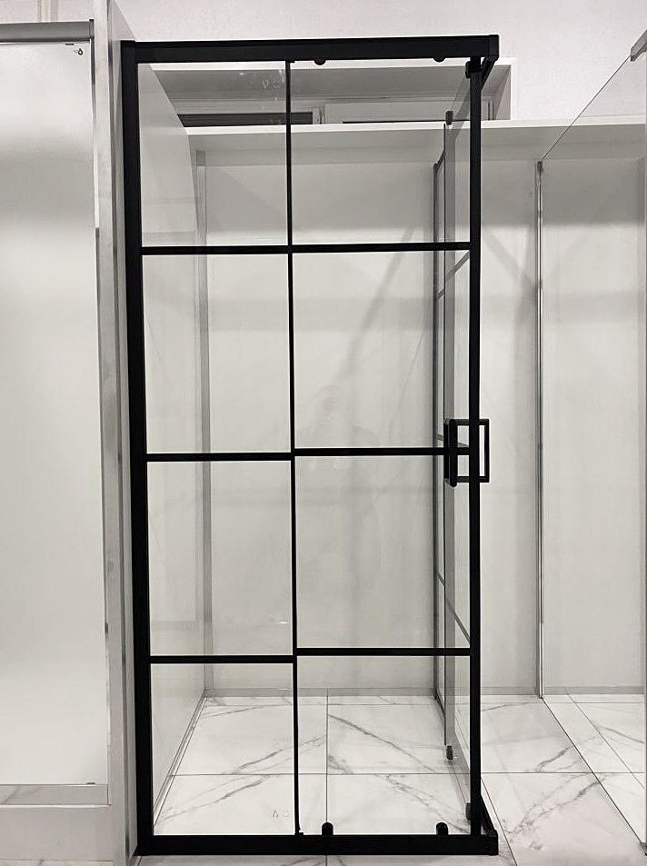 Квадратный душевой уголок. Две раздвижные двери из центра. Монтажный размер, мм: 780-800х780-800.